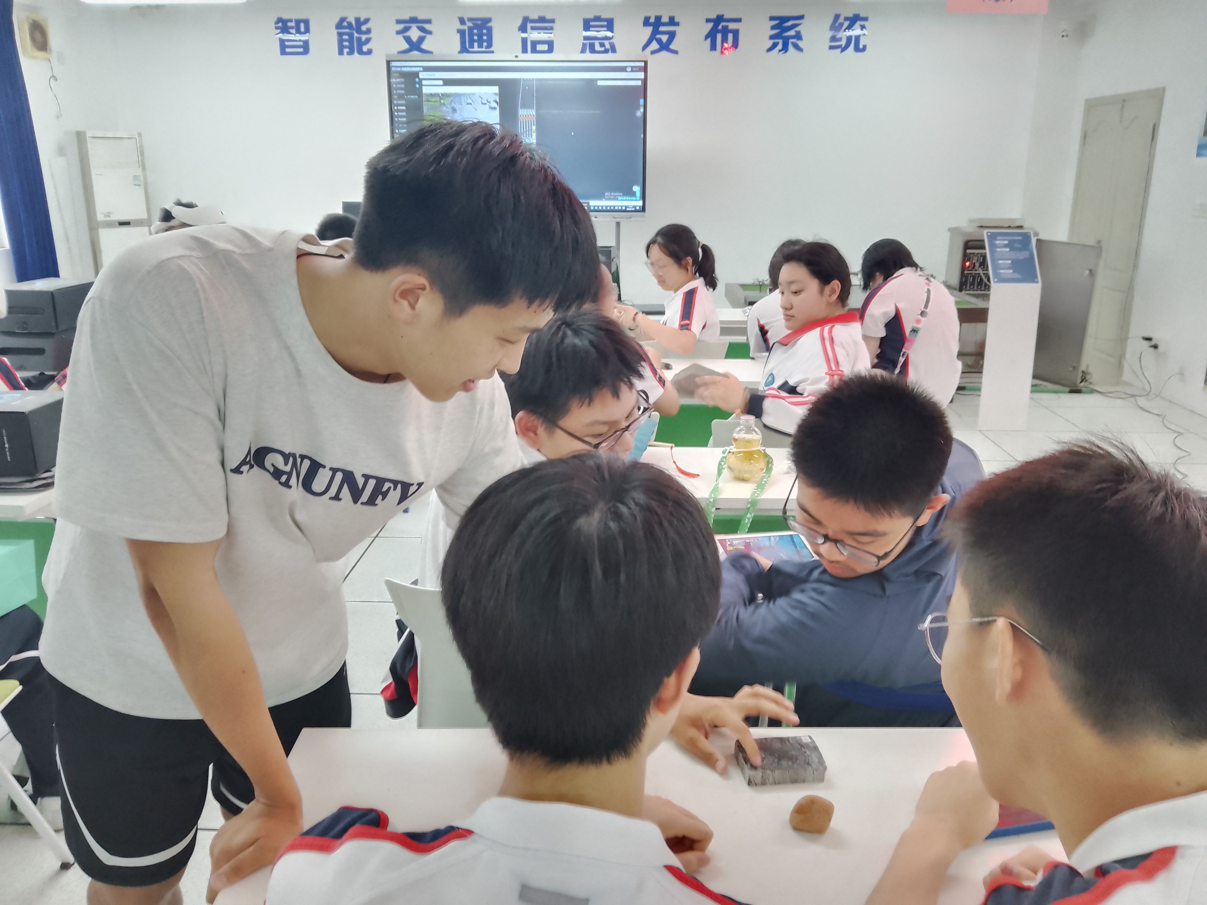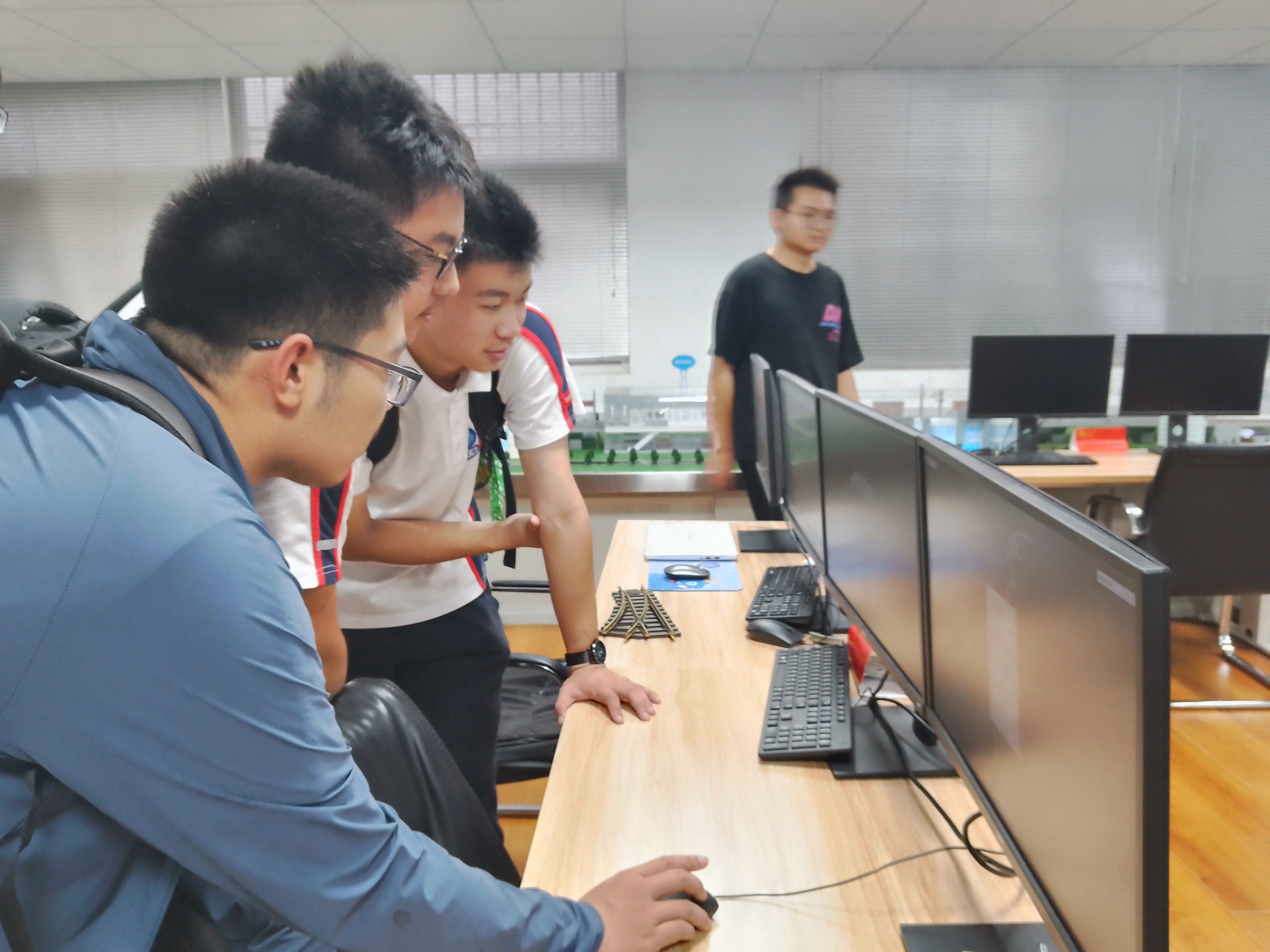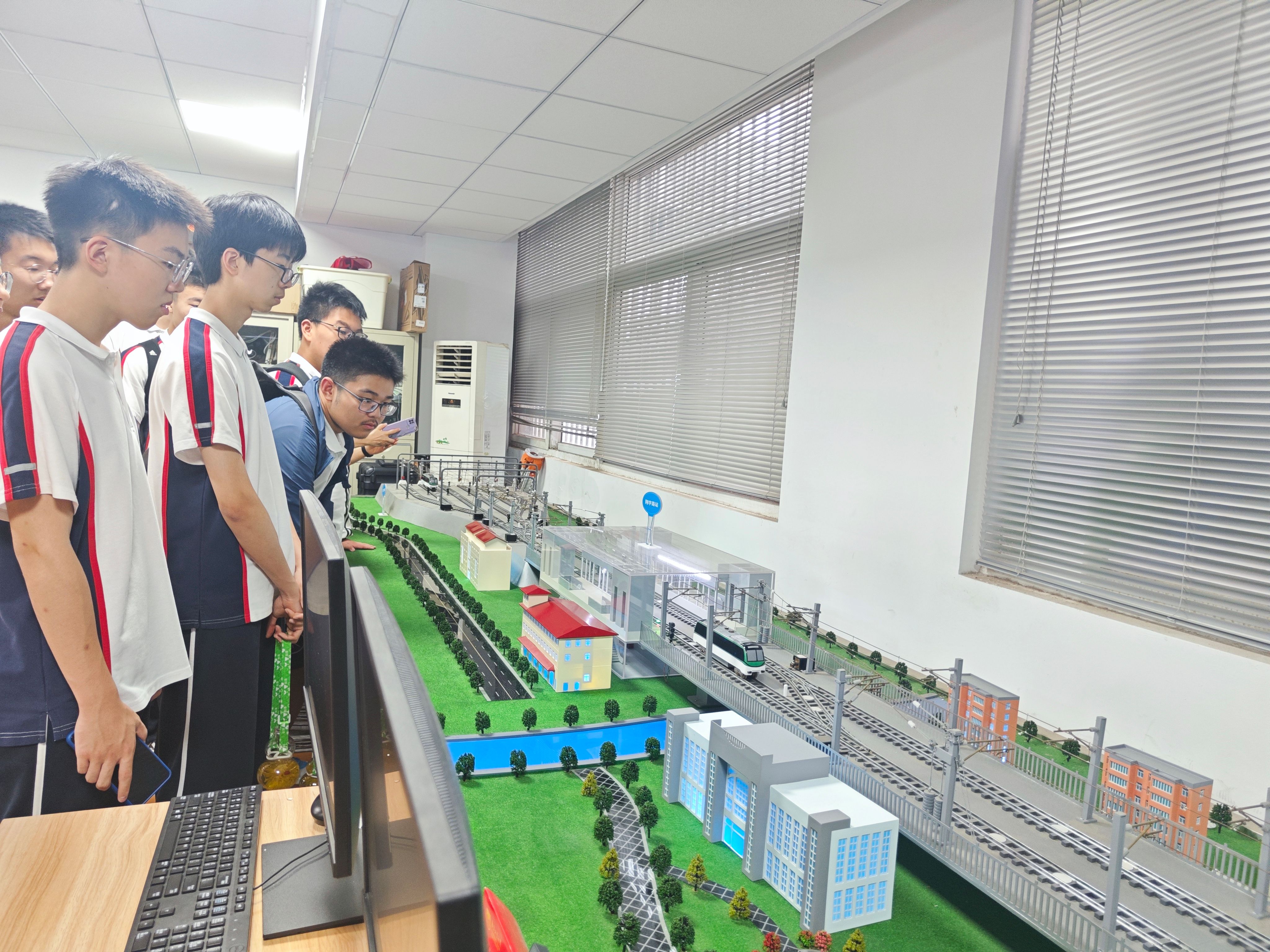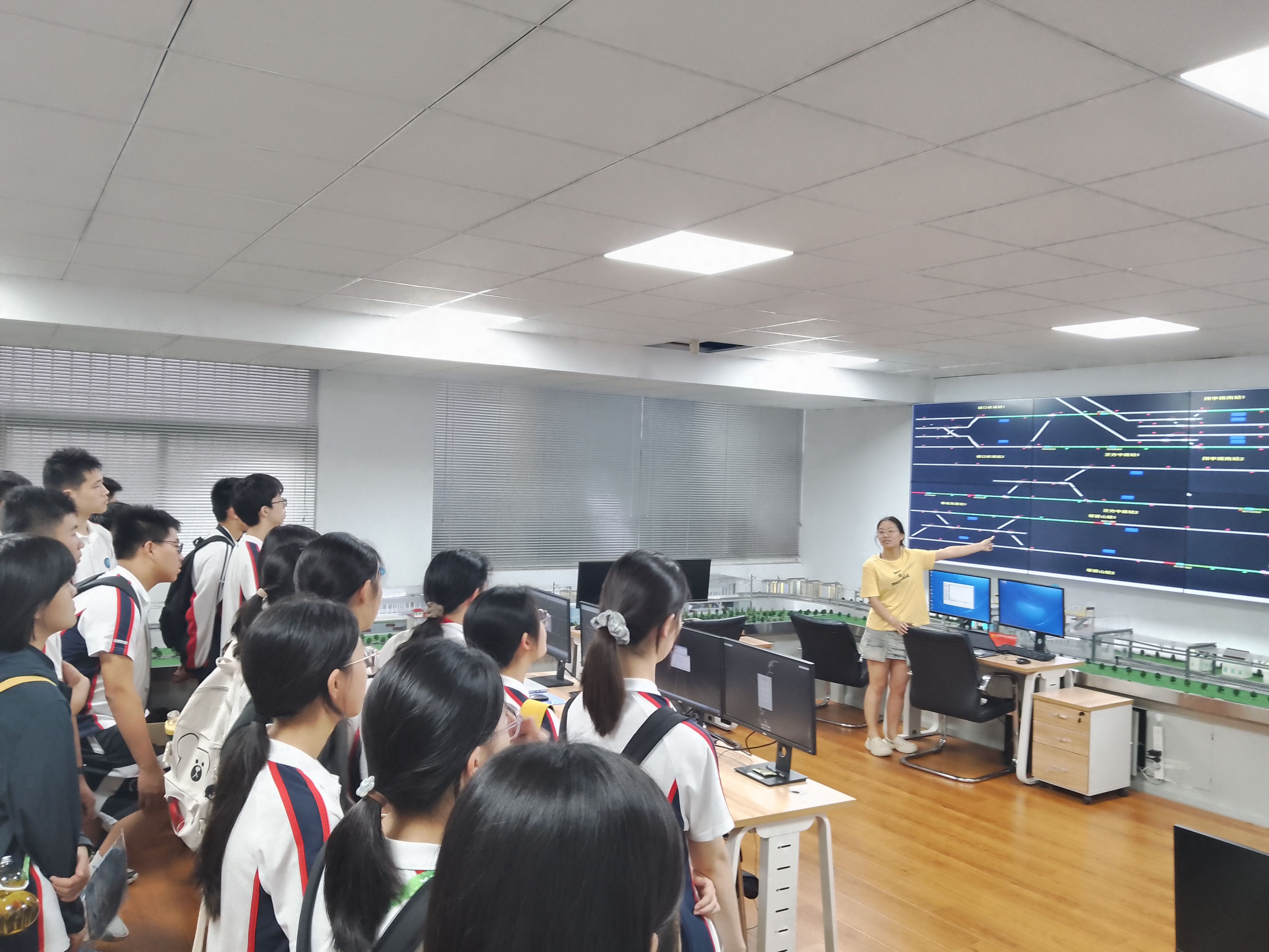 在轨道交通模拟实验室,工作人员利用调度仿真系统、车站仿真系统、电子沙盘系统进行联合演练,生动形象地让在场家长和同学体验了南京地铁S1号线路具体运营模式。