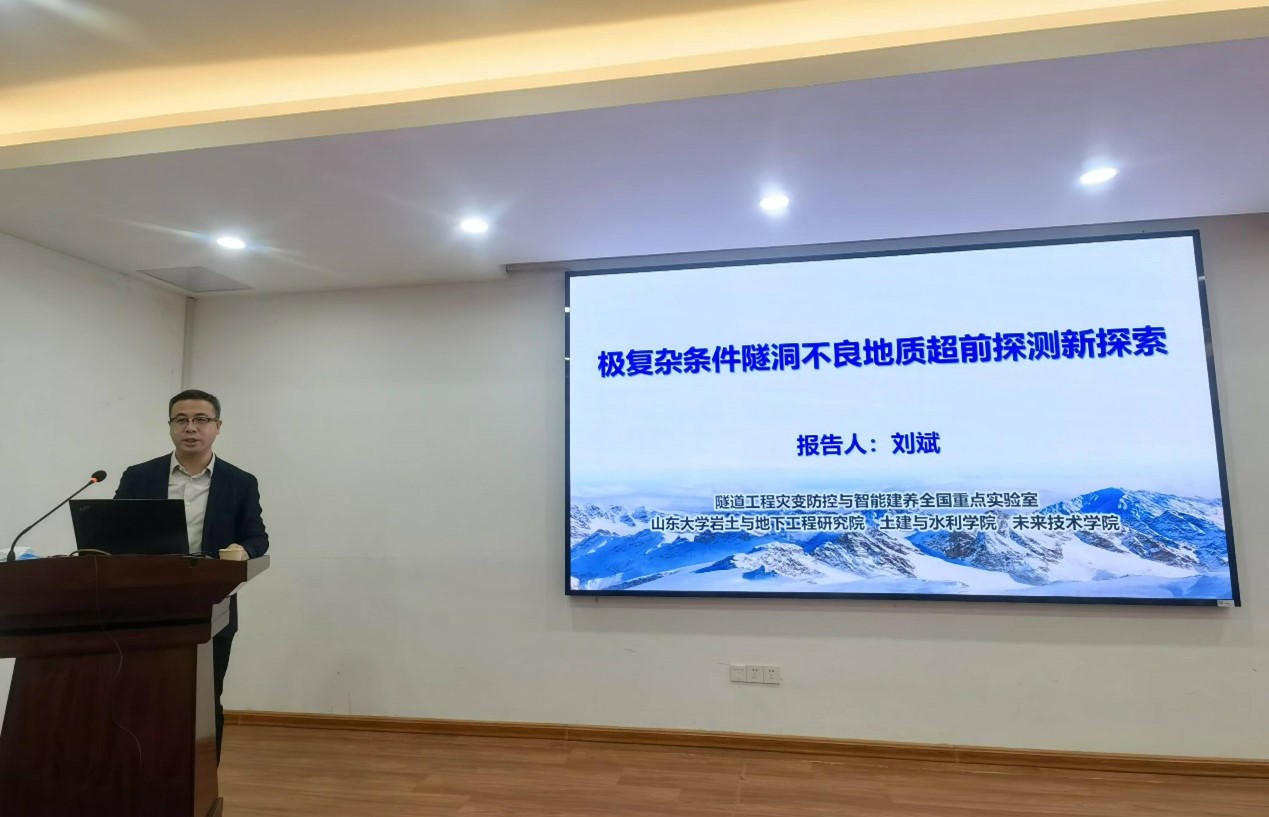 2025年1月5日上午,应公司邀请,山东大学土建与水利公司党委书记、未来技术学院执行经理、隧道工程灾变防控与智能建养全国重点实验室(山东大学)主任,国家杰出青年科学基金和中国青年科技奖获得者刘斌教授在天工楼530会议室作题为“极复杂条件隧洞不良地质超前探测新探索”的学术报告。报告会由副经理高洪梅教授主持,公司党委书记许翠梅、公司教授、青年教师及员工代表参加。