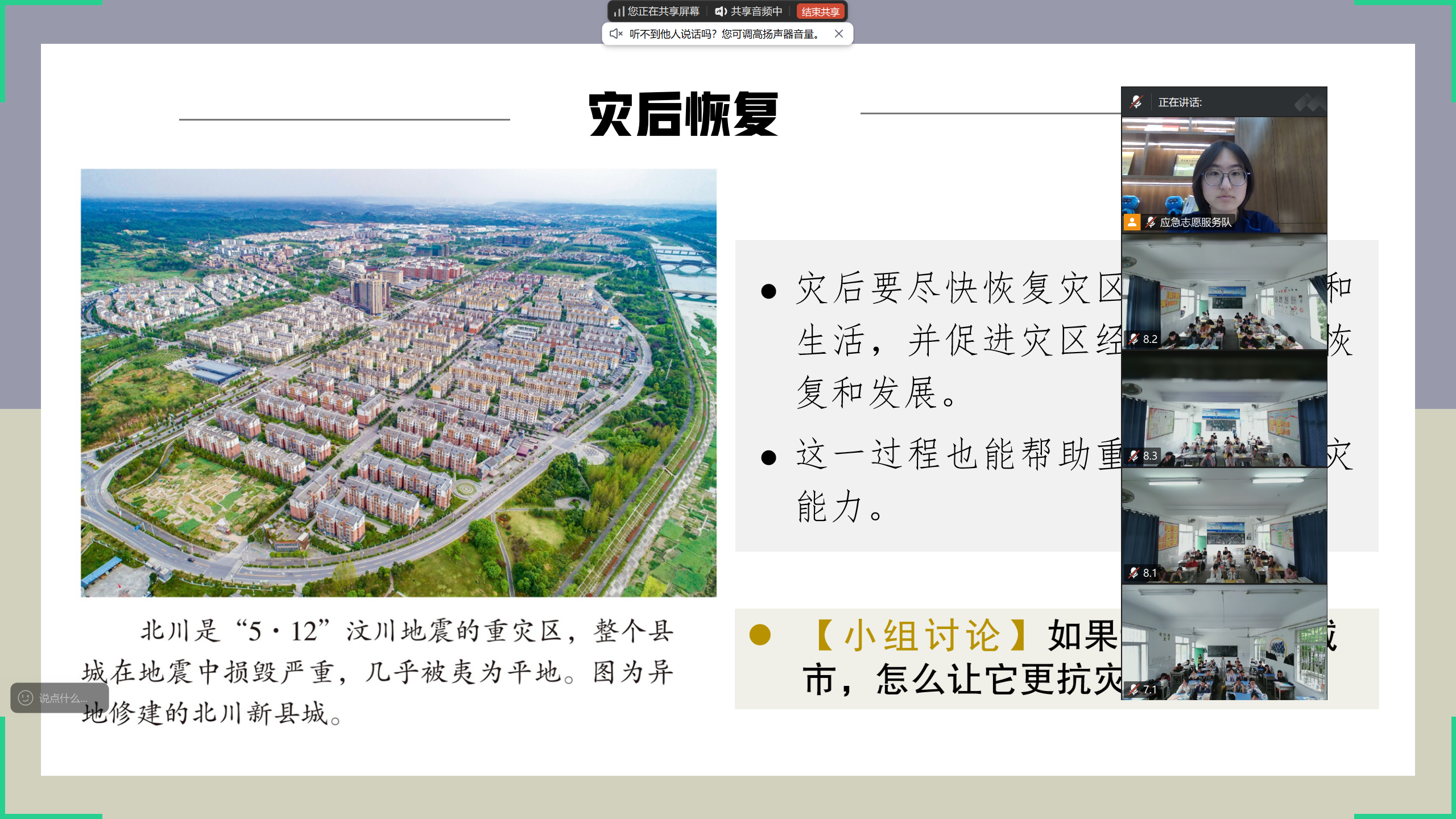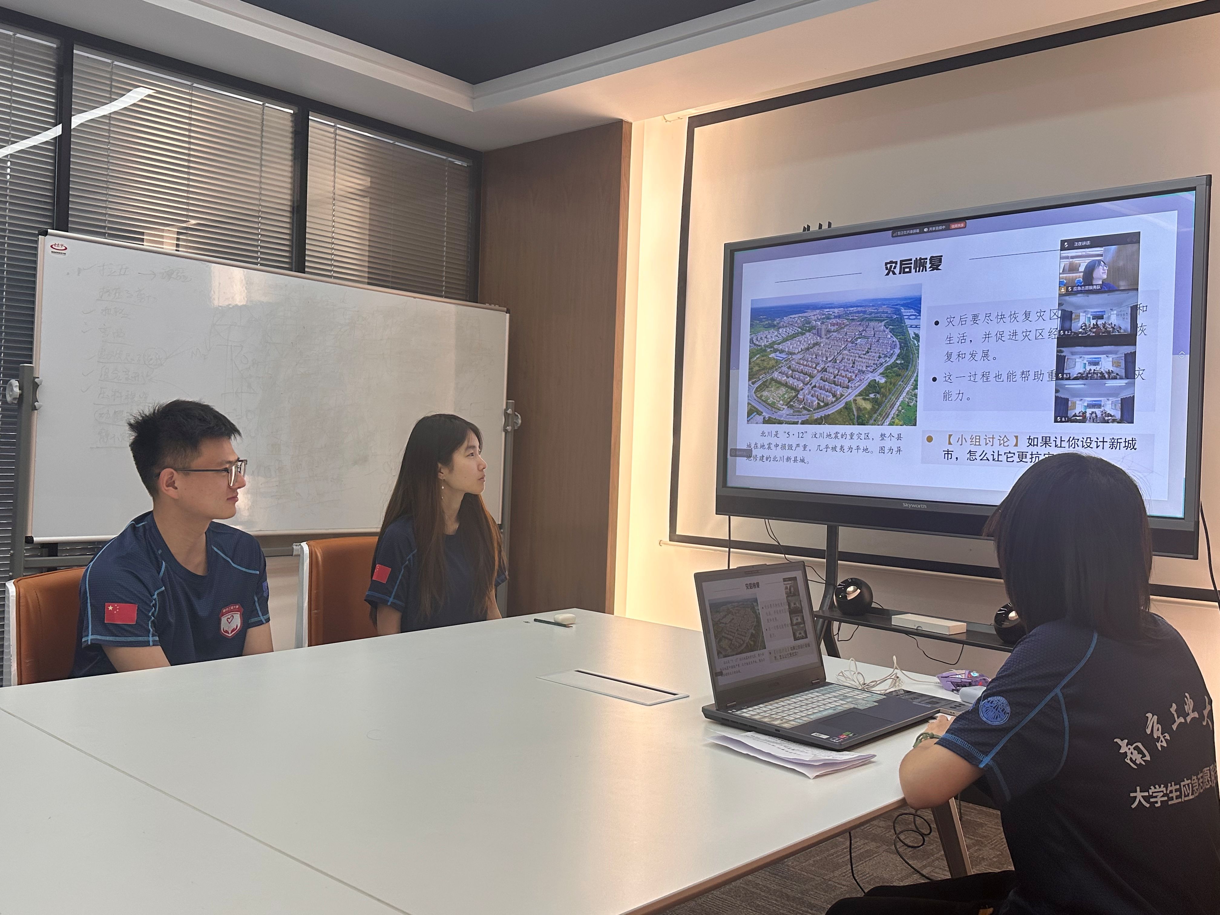 志愿服务队创新采用互动式教学模式,通过分析缅甸地震、汶川地震等真实案例,将专业知识转化为生动易懂的语言,系统讲解了我国自然灾害概况并聚焦当地的地质灾害特点。课堂中精心设计的“防灾减灾知识竞答”环节有效调动了课堂氛围,同学们在“共建抗灾韧性城市”的主题讨论中踊跃发言,展现出浓厚的学习兴趣。此外,课程特别设置了急救技能实操环节,志愿服务队通过线上示范教学,指导同学们分组练习心肺复苏(CPR)、创伤包扎等实用急救技能,同学们认真聆听,积极互动,提升了在紧急情况下的急救和应变能力。