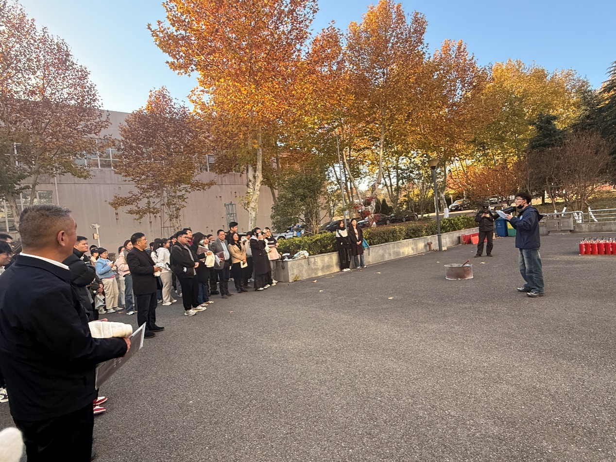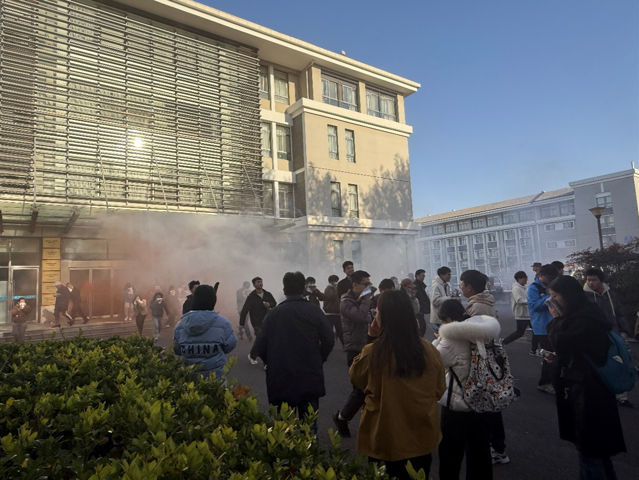 会议期间,杨会峰副经理介绍了活动背景及学院安全工作汇报,刘世伟科长和李强科长分别以《六院联合安全教育》和《实验室安全教育培训》为题做了邀请报告。活动第二阶段的消防演练由刘世伟科长指挥,模拟火灾现场,随着火灾自动报警系统启动,六院师生代表在滚滚浓烟中迅速有序疏散,完成消防逃生实战演习。疏散演练结束后,消防救援人员在立德楼前空旷区域设置了消防技能培训点。培训前开展了一场别开生面的消防知识趣味问答,激发了参与者的热情,现场气氛活跃。实操环节涵盖了消防防毒面具的正确佩戴、消防水带、灭火毯及灭火器的规范使用,进一步提升了应急处置能力。