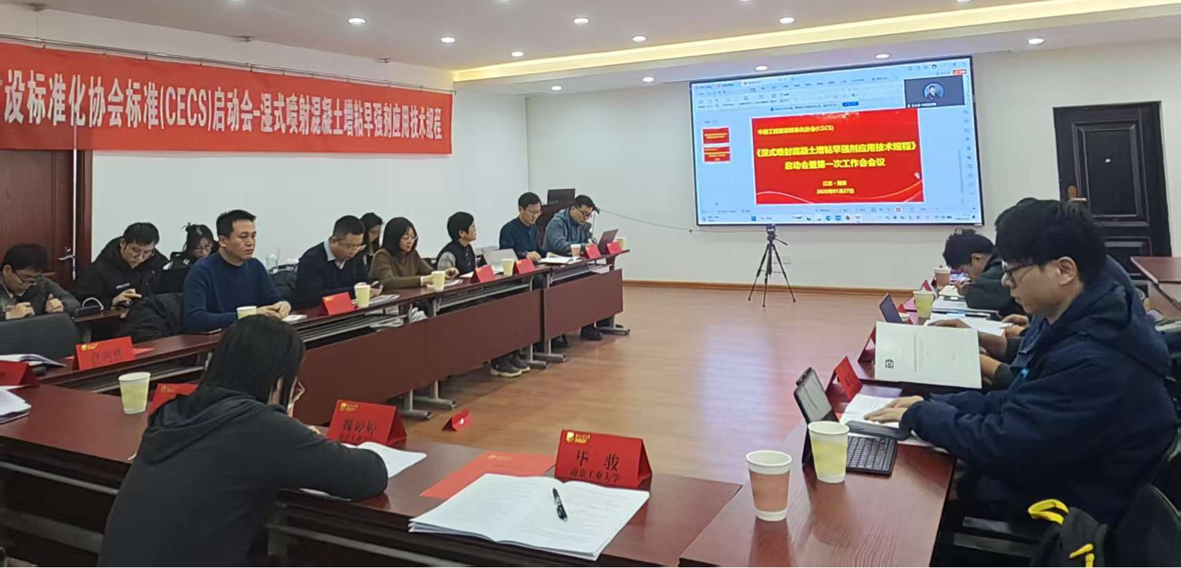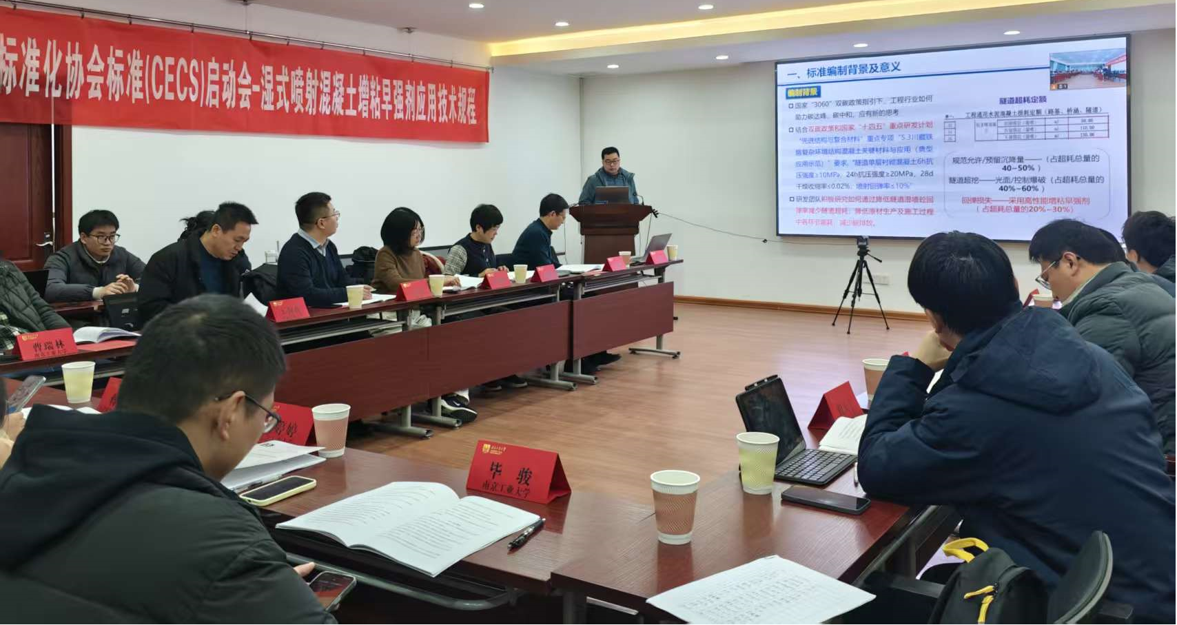 会上,中国工程建设标准化协会防水防护与修复专委会执行主任兼秘书长黄靖宣布了编制组成立并宣读了标准编写的有关规定。公司王盛年副教授就《湿式喷射混凝土增粘早强剂应用技术规程》编制工作进展及计划做了详细汇报。各参编单位分别就规程初稿内容修订积极建言献策。