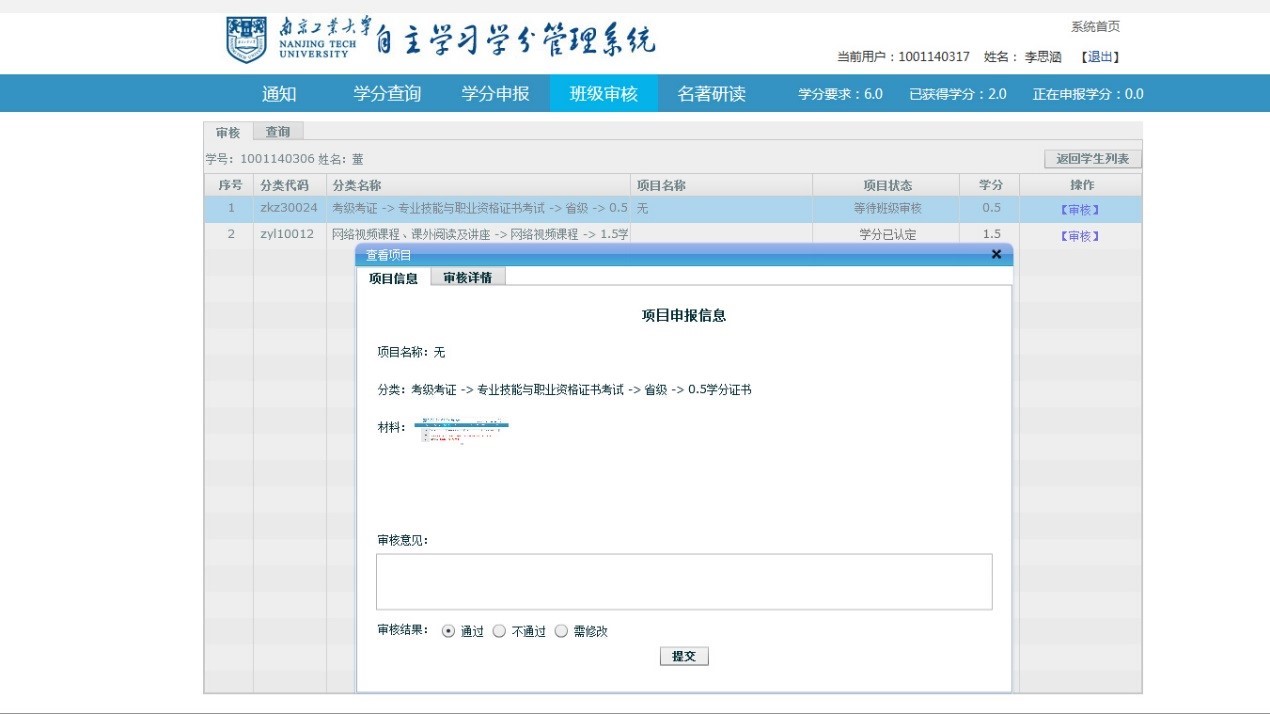 3. 审核:自主学习学分申请的网上审核工作由学院指定的审核助理完成。审核助理凭本人正方教务系统的账号、密码登陆“自主学习学分管理系统”,点击“班级审核”进入班级员工列表-选择某一员工,在“操作”列中点“项目”-进入审核界面后选择项目状态为“等待班级审核”的项目,在“操作”列中点“审核”-在弹出的界面中可查看员工申报的项目信息,审核意见可不填写,选择审核结果,点击提交。