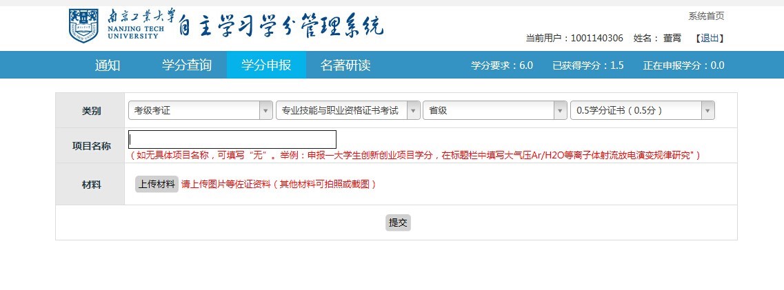 2. 申请:自主学习学分由员工本人提出申请,所在学院组织认定。除外语等级考试、江苏省计算机等级考试、名著研读成绩由管理员统一导入外,其余均需员工本人凭正方教务系统的账号、密码登陆“自主学习学分管理系统”(http://202.119.249.14/)进行填报。填报方式:点击“学分申报”-在下拉菜单中依次选择项目类别,项目名称可不填写-上传作证材料-点击提交。