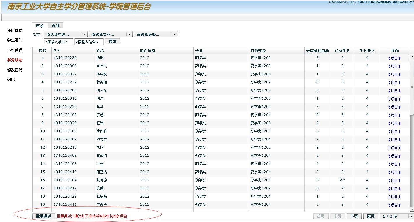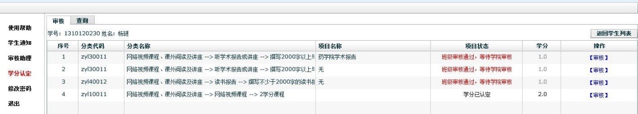 班级审核通过后,相应项目的状态将显示为“班级审核通过,等待学院审核”。需由教学秘书在“学分认定”界面左下角点击“批量通过”,相应项目的学分才能最终认定。