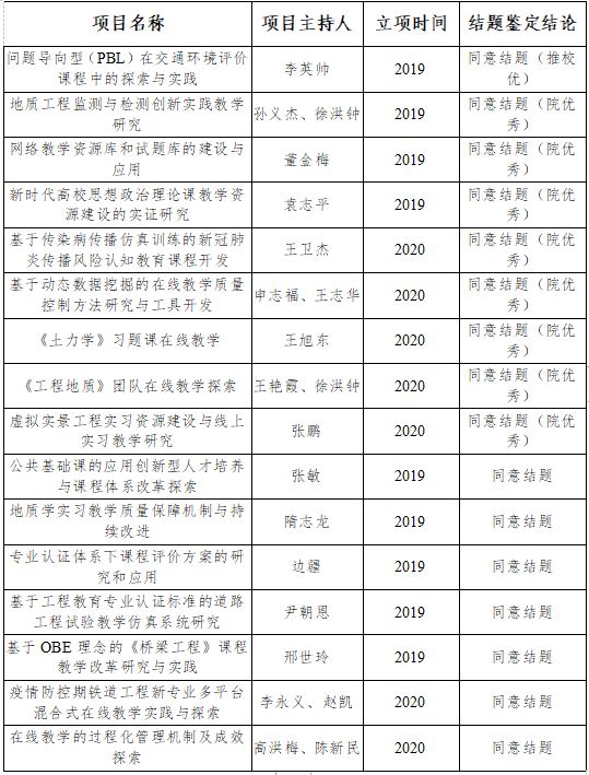 评审专家组认真查阅结题报告以及相关支撑材料,在充分了解各项目完成情况基础上,经过认真讨论给出教改项目评审结果,并对个别项目中存在的问题提出了意见和建议。最终同意16项教改项目通过验收,并推荐李英帅老师主持的《问题导向型(PBL)在交通环境评价课程中的探索与实践》项目参加校级评优答辩,孙义杰等8位老师主持的项目为院级优秀。