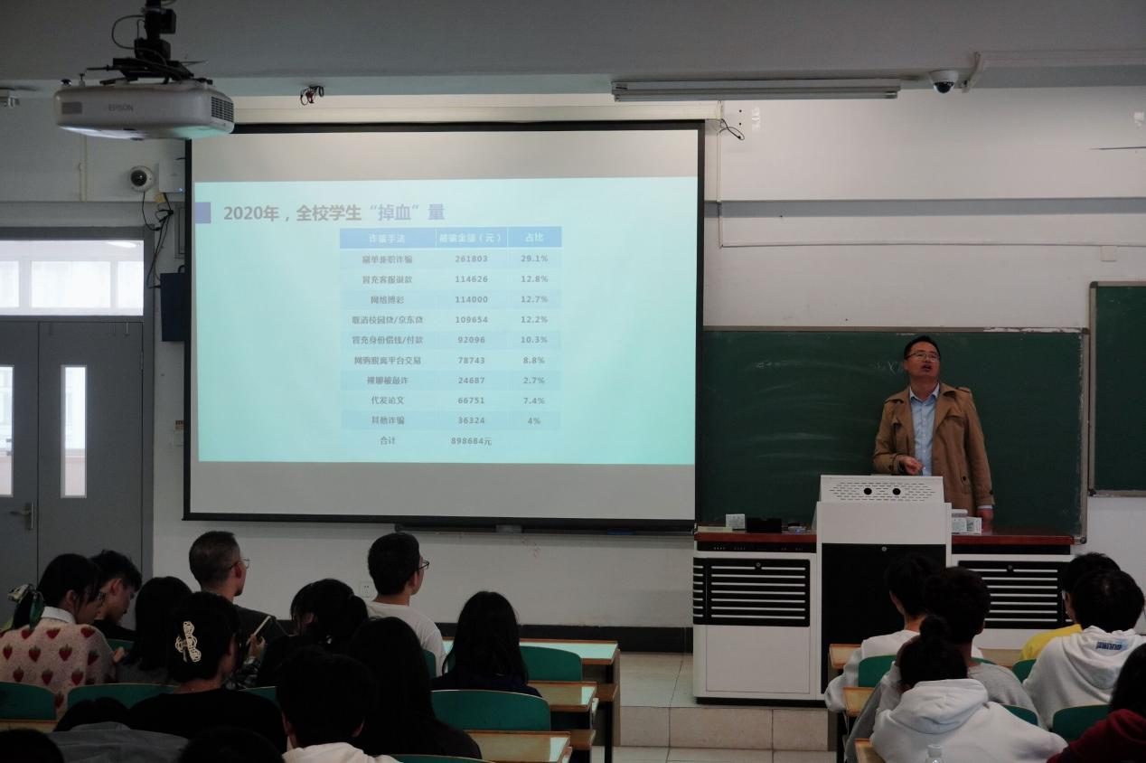 徐老师结合各类真实案例、视频,以案说法,就国家安全、网络安全、财产安全、交通安全、防电诈骗、宿舍防火、实验室安全等方面为新生做了深入的警示教育,让新生真切地了解到各类诈骗、火灾和校园贷等事件的严重性。徐老师要求全体新生加强警惕,警钟长鸣,牢固树立“安全第一”的思想,切实提高安全防范意识,做好各项安全防范,共同创造学校的和谐、宁静和平安。