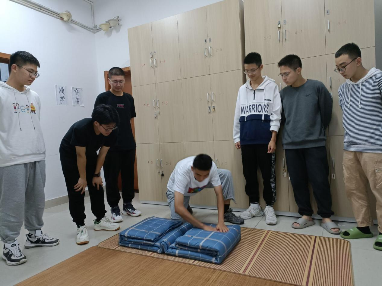 公司邀请高年级退伍复学的优秀员工,主动发挥退伍军人的模范带头作用,去新生宿舍指导内务整理,展示如何叠“豆腐块”式的方式,帮助同学们养成讲文明、爱卫生、勤劳动的好习惯。