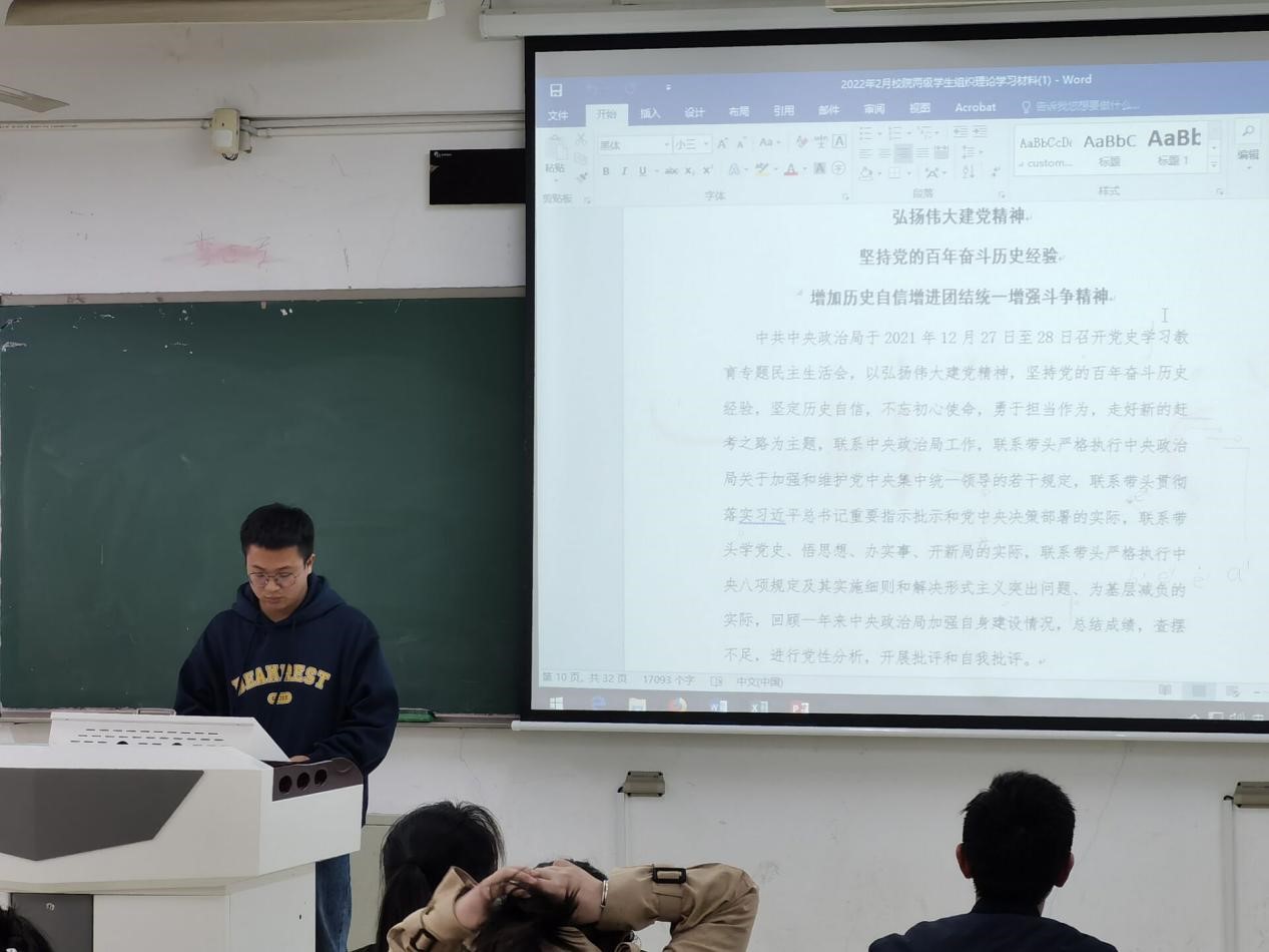 会上,领学人谭少艾带领同学们认真学习习近平总书记在党史学习教育动员大会上发表的重要讲话和党的十九届六中全会精神,努力提高自身政治意识、大局意识、核心意识、看齐意识。主席团成员、各部门负责人对上学期的工作进行汇报,对工作期间的不足进行反思,并制定了下一步工作计划。袁志平老师总结上学期员工会工作的亮点与不足,要求同学们不断加强理论学习,主动学习党团有关理论和业务知识,勉励全体员工会干部在保证自身学业的基础上,坚持把爱国爱党与团学工作有机结合起来,做到互相促进、相得益彰。