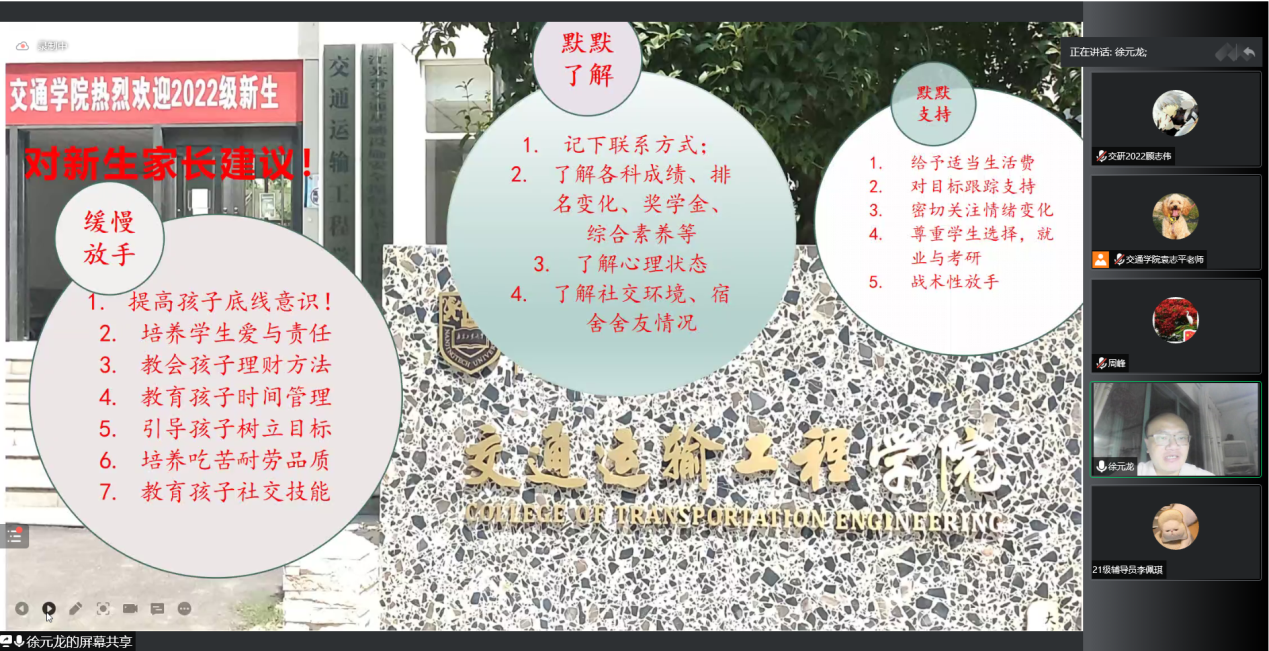 22级辅导员袁志平介绍了新生入学教育计划、大学新环境学习生活方面适应等情况。21级辅导员李佩琪就员工学业数据、学涯规划、学业目标制定方法等进行解读。徐元龙副书记深刻分析当前高校老员工挂科甚至退学的主要原因,就员工各项数据结合员工学习生活状态进行分析,对家长们提出了三点建议,希望家长做员工成长路上最坚强的后盾,与学校同向同行。许翠梅书记感谢各位家长朋友对学院人才培养和发展事业的支持,向大家在与孩子交流中提出六点指导意见。第一,积极入党,培养红色基因;第二,专业自信,投身交通强国建设;第三,有教无类,因材施教;第四,不做甩手掌柜,关注员工成长和学习;第五,给予支持,树立正确自我价值观;第六,密切联系,引导员工不负时代、不负国家。高洪梅副经理详细介绍了学院专业情况、学业要求、科创及学科竞赛等。吴志坚副经理就公司产品方面进行讲解,介绍了学院雄厚的团队力量和丰硕科研成果,希望家长们尽早为员工的读研梦想规划学业阶段目标。周峰经理以“天地交 万物通”为题,详细介绍了学院发展历史、学科专业等,展望交通基础设施建设行业广阔的发展前景,并对家长提出了各类专业发展问题给予细致答复。