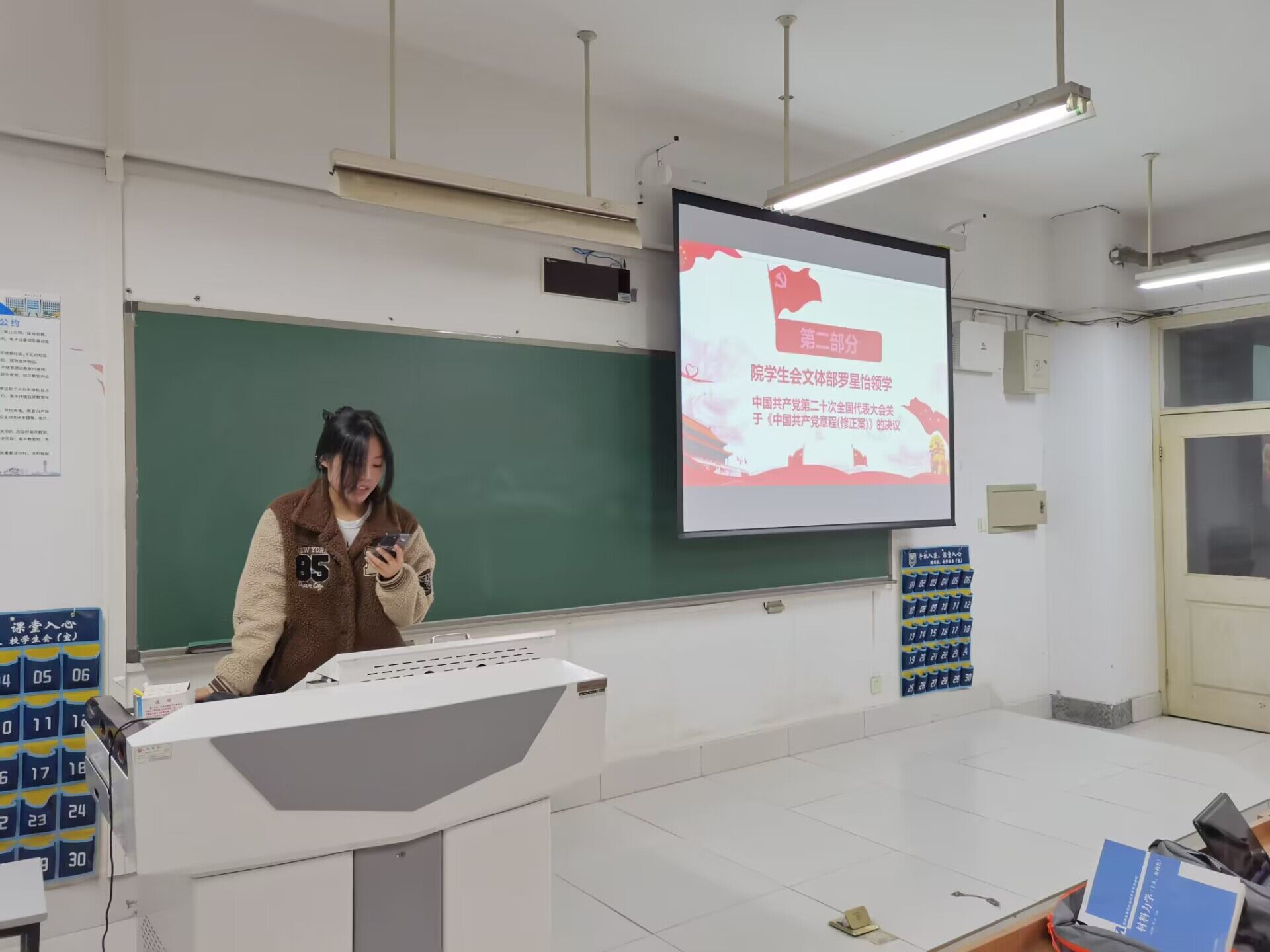 心理生活部杜晨曦领学《高举中国特色社会主义伟大旗帜 为全面建设社会主义现代化国家而团结奋斗——在中国共产党的二十次全国代表大会上的报告》,号召同学们在党的旗帜下风雨无阻向前行,一步一个脚印,把党的二十大作出的重大决策部署付诸行动、见之于成效。文体部罗星怡领学党的二十大关于《中国共产党章程(修正案)》的决议,希望同学们认真学习党章、全面把握党章修改的重要内容、严格遵守党章。员工骨干们分享了学习党的二十大精神后的心得体会,纷纷表示一定会持续学习宣传贯彻党的二十大精神,牢记习近平总书记的嘱托,永远跟党走,奋进新征程。