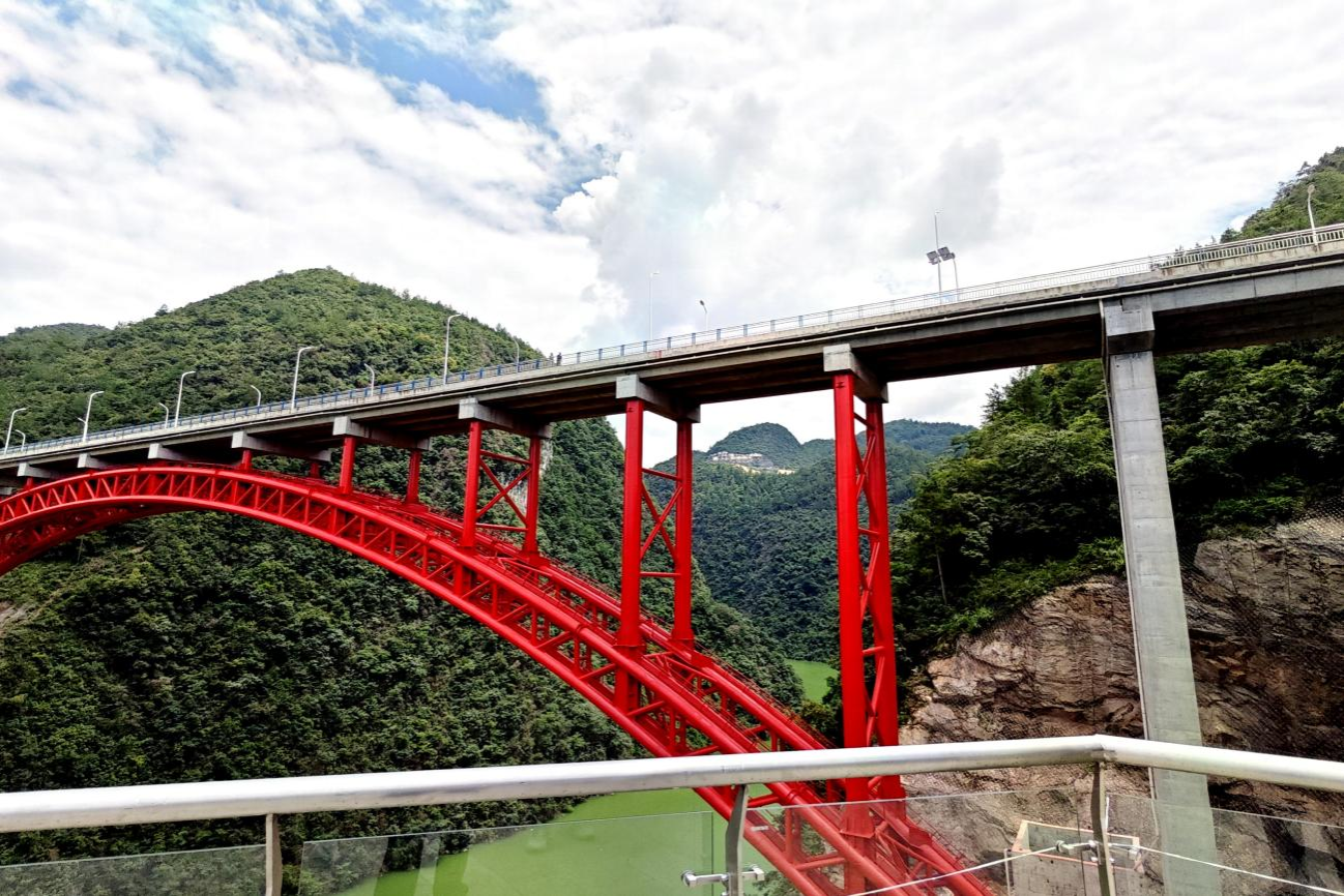 实践团恩施小分队来到唐崖河上,看到朝阳大桥如一道彩虹凌空而起,与湖光山色辉映成趣。朝阳大桥于2022年11月25日正式建成通车。大桥总长276米,为上承式钢管混凝土拱桥,红色拱架,蔚为壮观。朝阳大桥及唐朝旅游公路建成通车,不仅解决了村民出行难问题,还对整合恩施咸丰县旅游资源,构建大交通、发展大旅游起到促进作用。