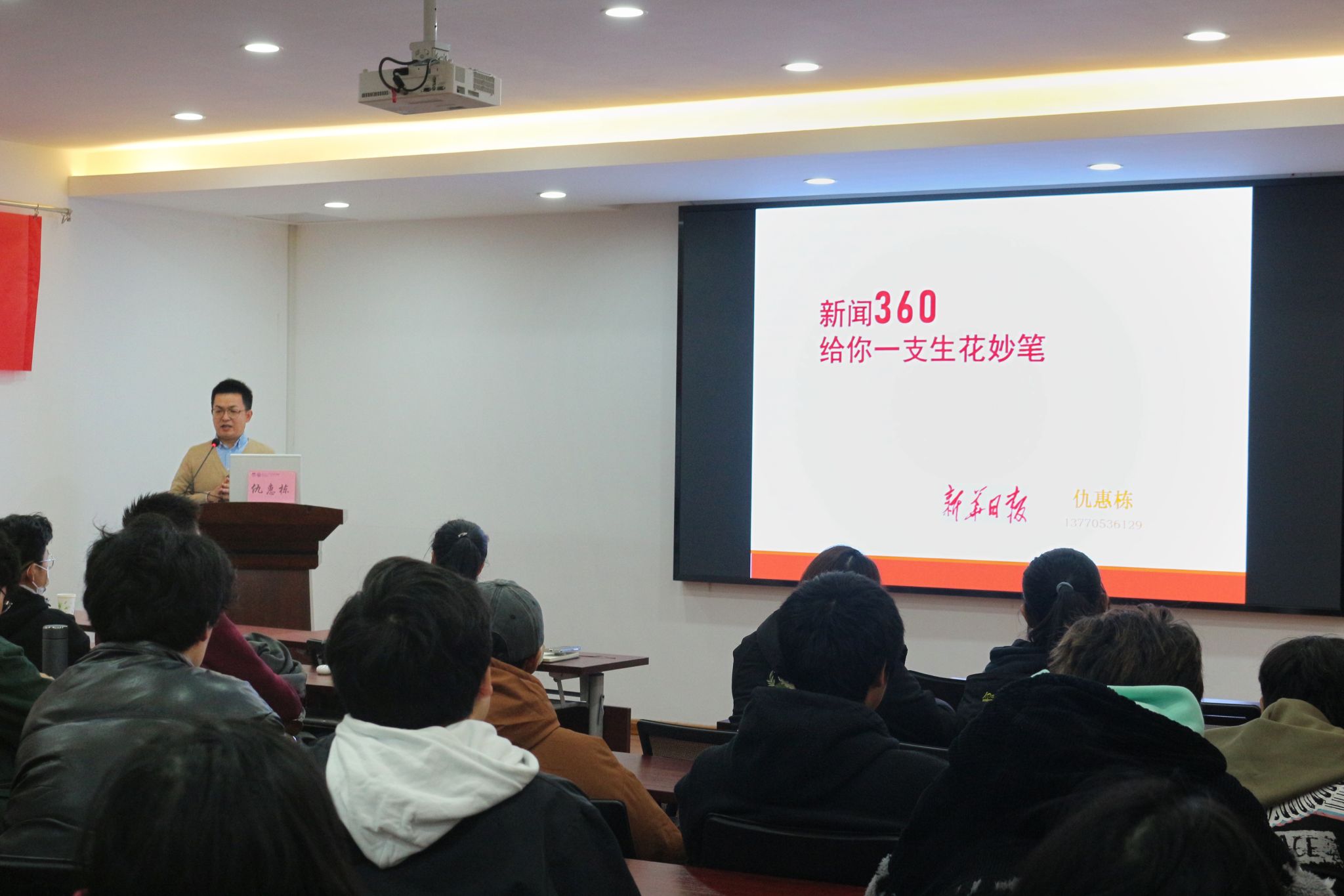 仇惠栋先生以《给你一支生花妙笔》为题,重点围绕“读者爱看什么样的新闻”和“如何写好新闻”两个方面展开。他强调,受读者欢迎的新闻应具备“新”、“实”、“高”三个特征,即有新意、有实例、有高度。关于如何写出这样的新闻,仇先生提出了“三个招式”: 上看下看,文章“顶天立地”,有高度和温度;东张西望,材料“视野开阔”,有广度和厚度;做到瞻前顾后,稿子“顺势而为”,有尺度和深度。