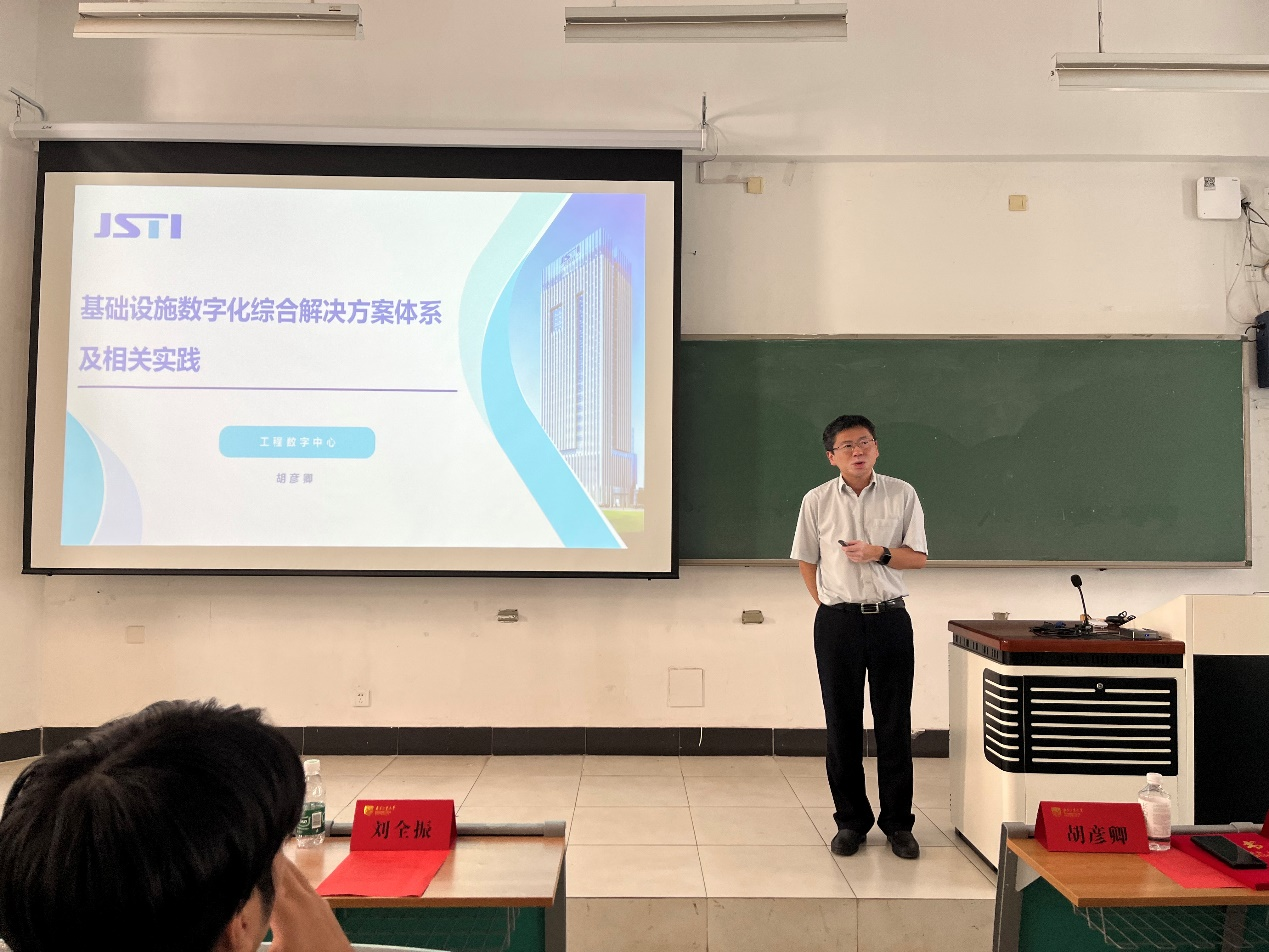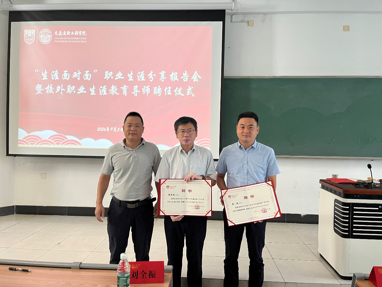报告会伊始,刘全振副书记向胡彦卿、李健颁发校外职业生涯教育导师聘书。胡彦卿、李健导师分别作主题为“基础设施数字化综合解决方案体系及相关实践”和“乘风而行、逆流而上——传统交通行业人员数字化转型过程中的感想”的报告。胡彦卿导师从政策层面、专业技术层面详细介绍了基础设施数字化发展背景、综合解决方案以及应用实践。李健导师以从业十余年的经历现身说法,分享了自己职业成长之路以及关于择业、工作、积累和发展的感想。