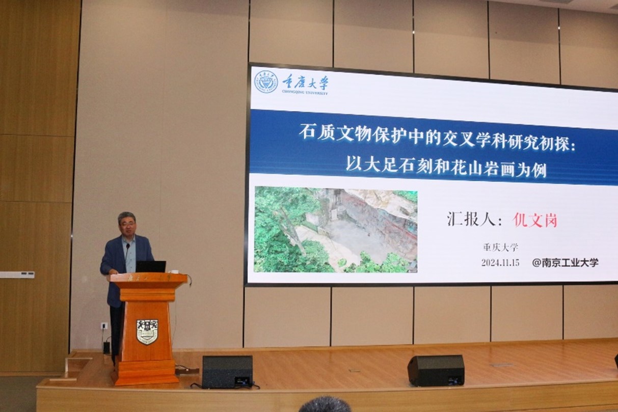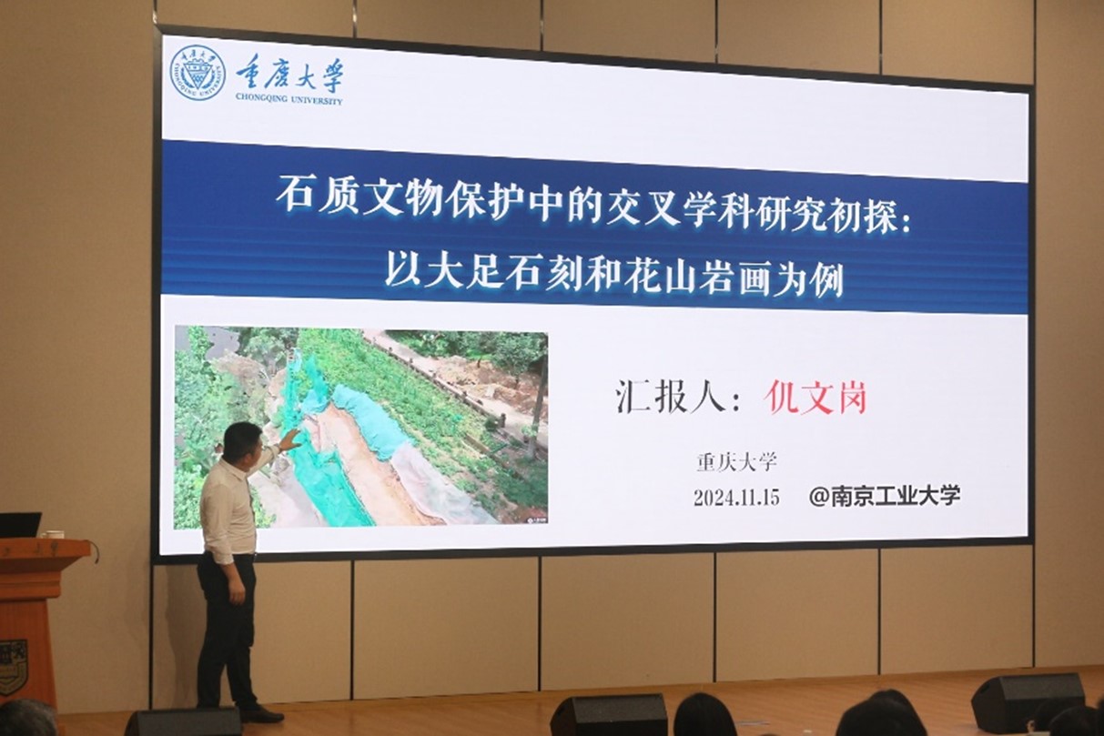 仉文岗教授分别从宝顶山大佛湾崖壁岩体精细化建模与时效劣化研究和广西崇左花山岩画相关科研两个方面进行了报告。报告以大足石刻与花山岩画两处世界文化遗产为切入点,深入分析了石质文物保护的复杂性及多学科交叉研究的重要性。仉文岗教授详细介绍了宝顶山大佛湾保护项目由来、工程地质概况、宝顶山大佛湾崖壁系统监测与分析、精细化数值模型构建与三维崖壁岩体稳定性数值分析、温度-渗流-应力-化学多场耦合时效劣化研究以及微生物对时效劣化的影响研究。随后,仉文岗教授介绍了广西崇左花山岩画遇到的植物根系破坏的问题,并针对该问题提出了基于计算根尖颗粒合力的算法来计算“最小钻探阻力”路径。