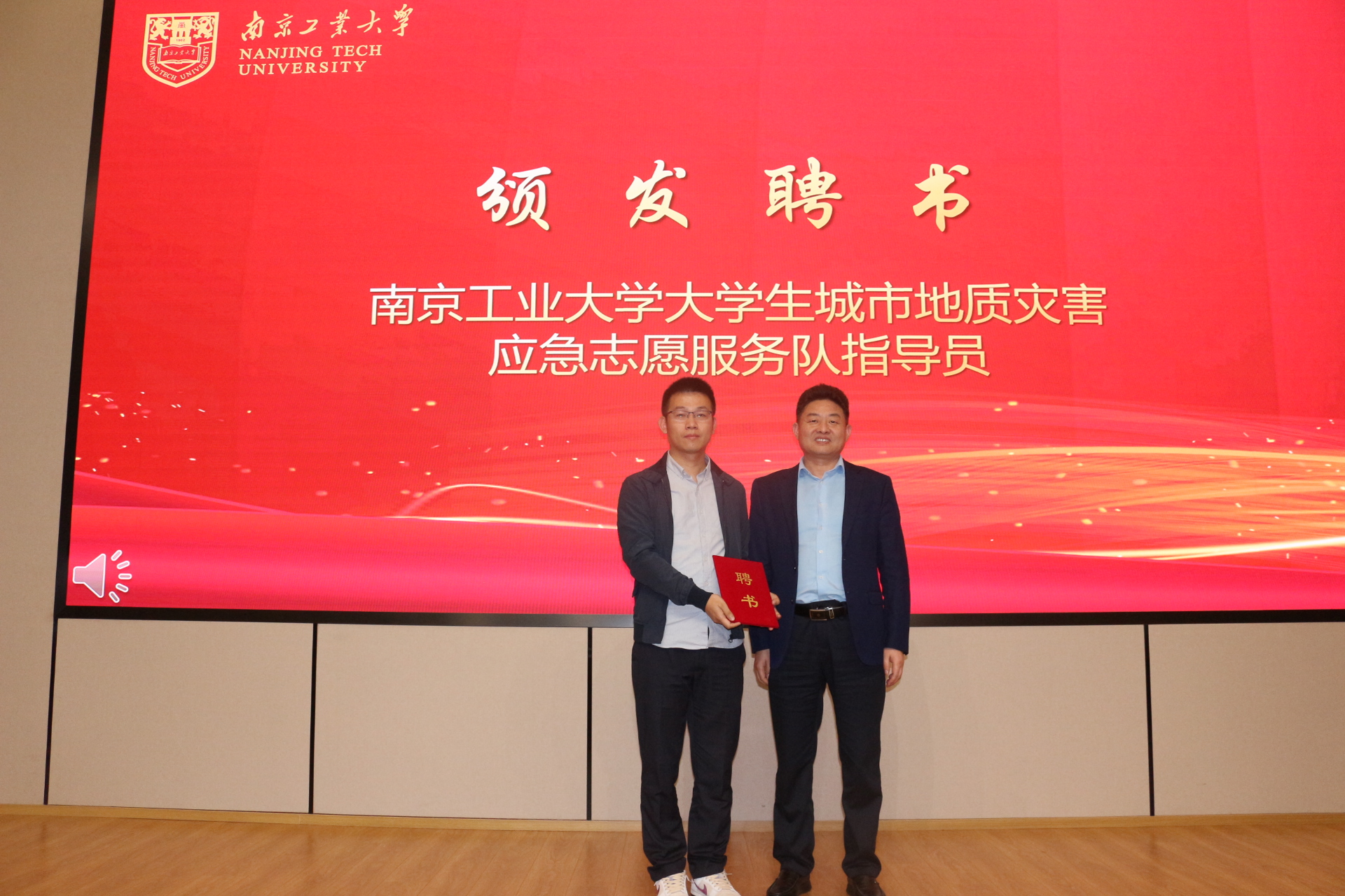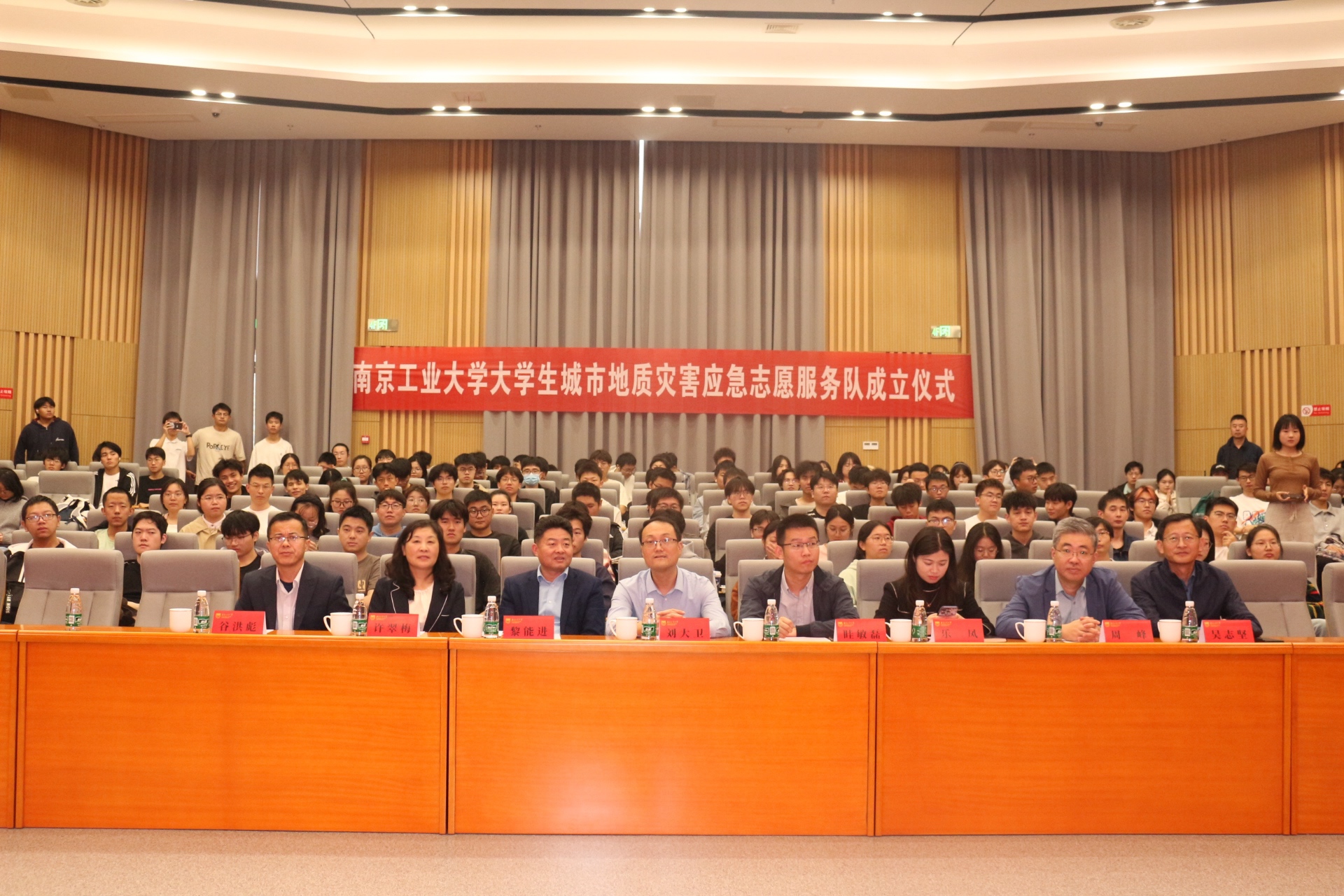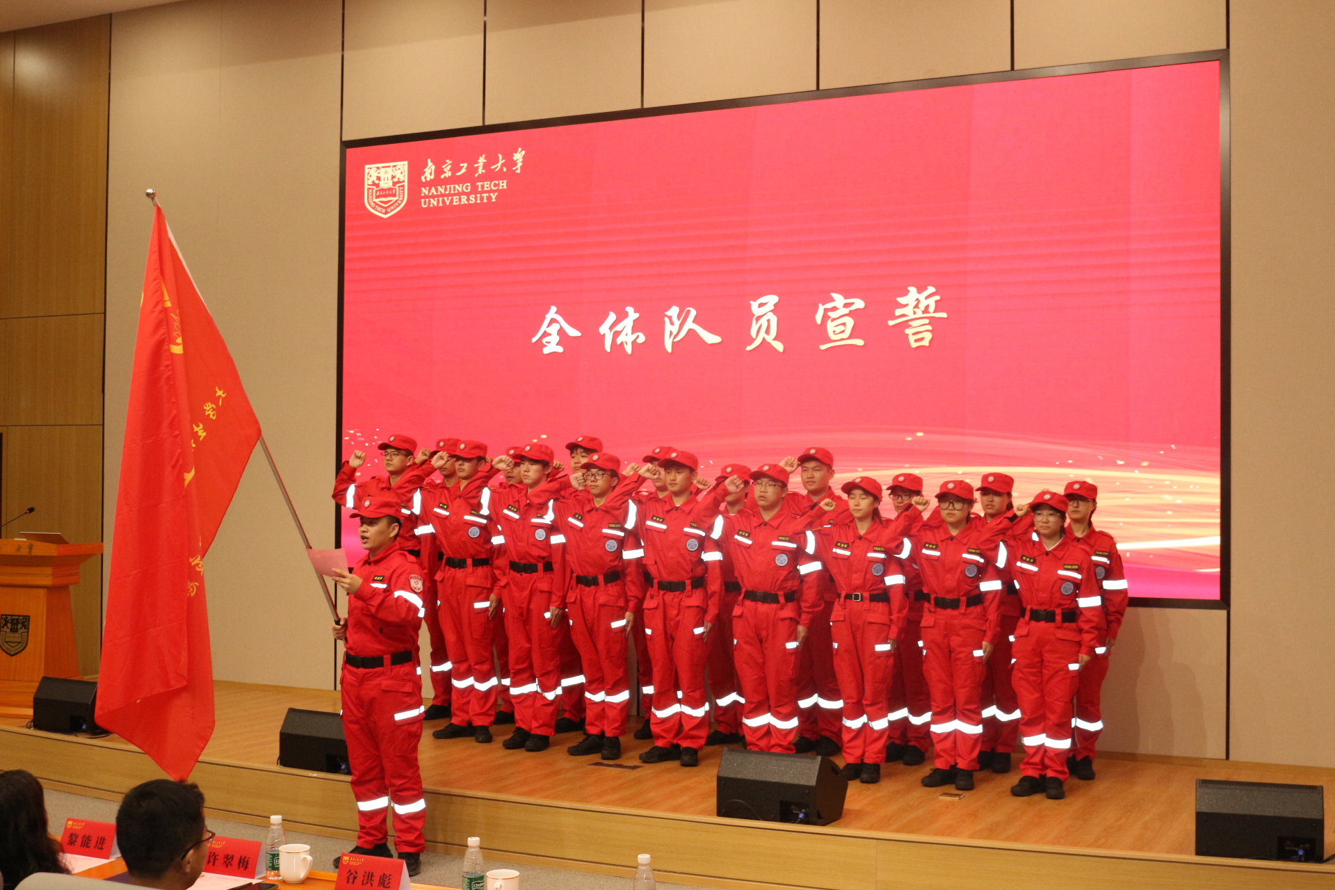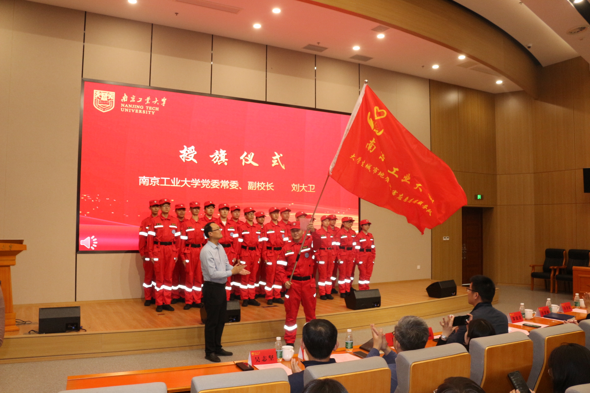 许翠梅书记在致辞中介绍队伍前期筹建情况,强调服务队在防灾减灾宣传教育和专业实践中的重要作用。周峰经理宣读成立决定和首批队员名单。服务队聘请谷洪彪、眭敏磊担任校内外指导员,黎能进处长、乐凤副书记分别为服务队指导员颁发聘书。服务队全体队员庄严宣誓,表达了为防灾减灾事业贡献力量的决心。眭敏磊主任在讲话中表达对队伍的肯定和期待,分享应急救援的宝贵经验,为队伍建设指明建设方向。刘大卫副董事长为服务队授旗并提出三点期望:要牢牢把握实践育人功能,打造一支有使命感、荣誉感的队伍;要聚焦动员青年建功立业,打造一支有真本领、硬功夫的队伍;要完善队伍建设体制机制,打造一支有活力、肯担当的队伍。