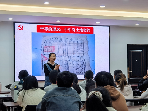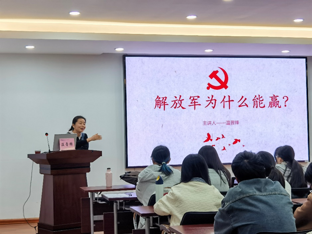 温教授从《解放军为什么赢?》一书引入,深入浅出地带领同学们探讨了赢得胜利的两个重要因素,即平等的理念与制度的创新。她从手中有土地契约、心中有理想信念、用平等的关系处理人与人之间关系三个方面详细阐述了“平等的理念”的贯彻;从农村包围城市路线的选择、正确灵活的战略战术和调查究方法三个角度力证了“制度创新”的智慧。帮助同学们重新见证了中国共产党带领全国各族人民努力拼搏取得的一个又一个伟大成就的历史历程,引导员工坚定“四个自信”。温教授结合以往员工的事例,教育同学们要端正入党动机,在实践中检验发展自己,日臻卓越,不断提升为人民服务的能力。
