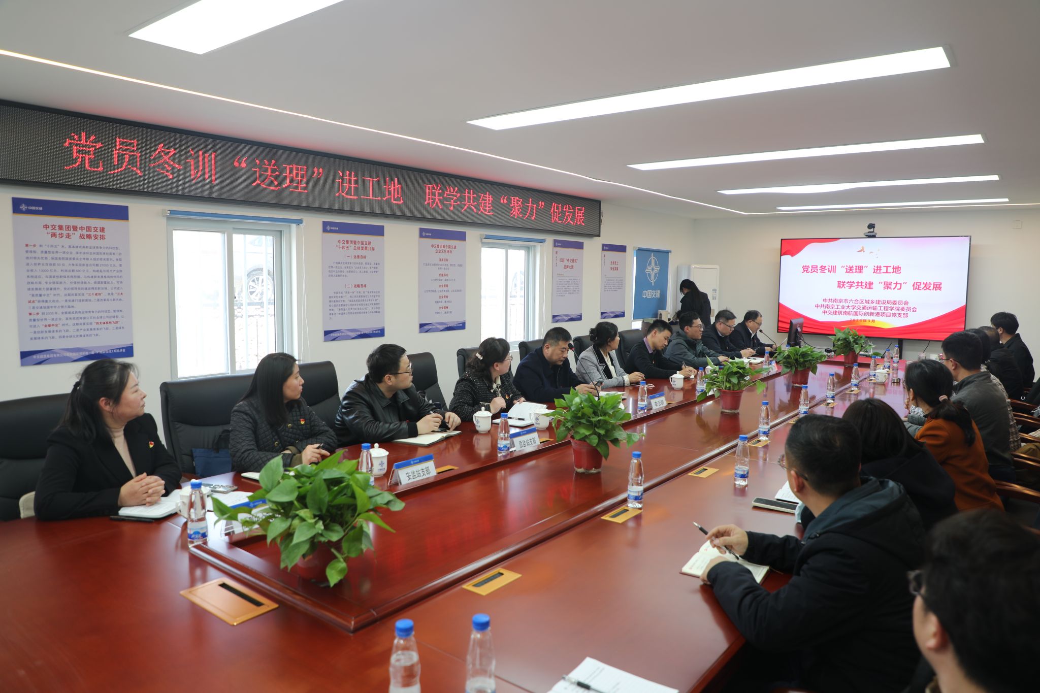近日,南京市六合区城乡建设局联合南工大太阳成集团tyc122cc走进南航创新港项目部,开展“党员冬训‘送理’进工地,联学共建‘聚力’促发展”活动,为项目部参建单位和职工送去“理论套餐”。区城乡建设局机关第二党支部、区质量监督站党支部、区安全监督站党支部、区质量检测中心党支部党员,太阳成集团tyc122cc部分党员,南航创新港项目部负责人、党员及部分职工代表约40人参加活动。
