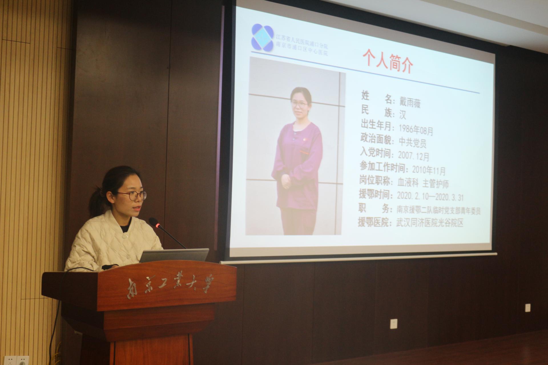 戴雨薇护士长以“抗疫斗争中践行医者的使命”为主题,通过演讲与视频的方式讲述了自己援鄂的工作经历。身为一名党员,在祖国需要时冲锋陷阵是义不容辞的责任,在疫情蔓延的第一时间,她就与同事主动请缨支援武汉,告别亲人和朋友,义无反顾来到战役第一线,守护着一个个生命垂危的陌生人。在病房里,他们要穿着防护服为患者抽血、静脉输液,哄智障患者吃药。在援鄂的52天里,戴护士长所在的南京二队取得了“零感染、零死亡、零差错”的优秀战果。回到南京后,戴护士长继续奋斗在抗疫第一线,为不明原因发热病人进行预检和收治。戴雨薇护士长充分展示了身为党员的责任与担当,身为医者的大爱无私。