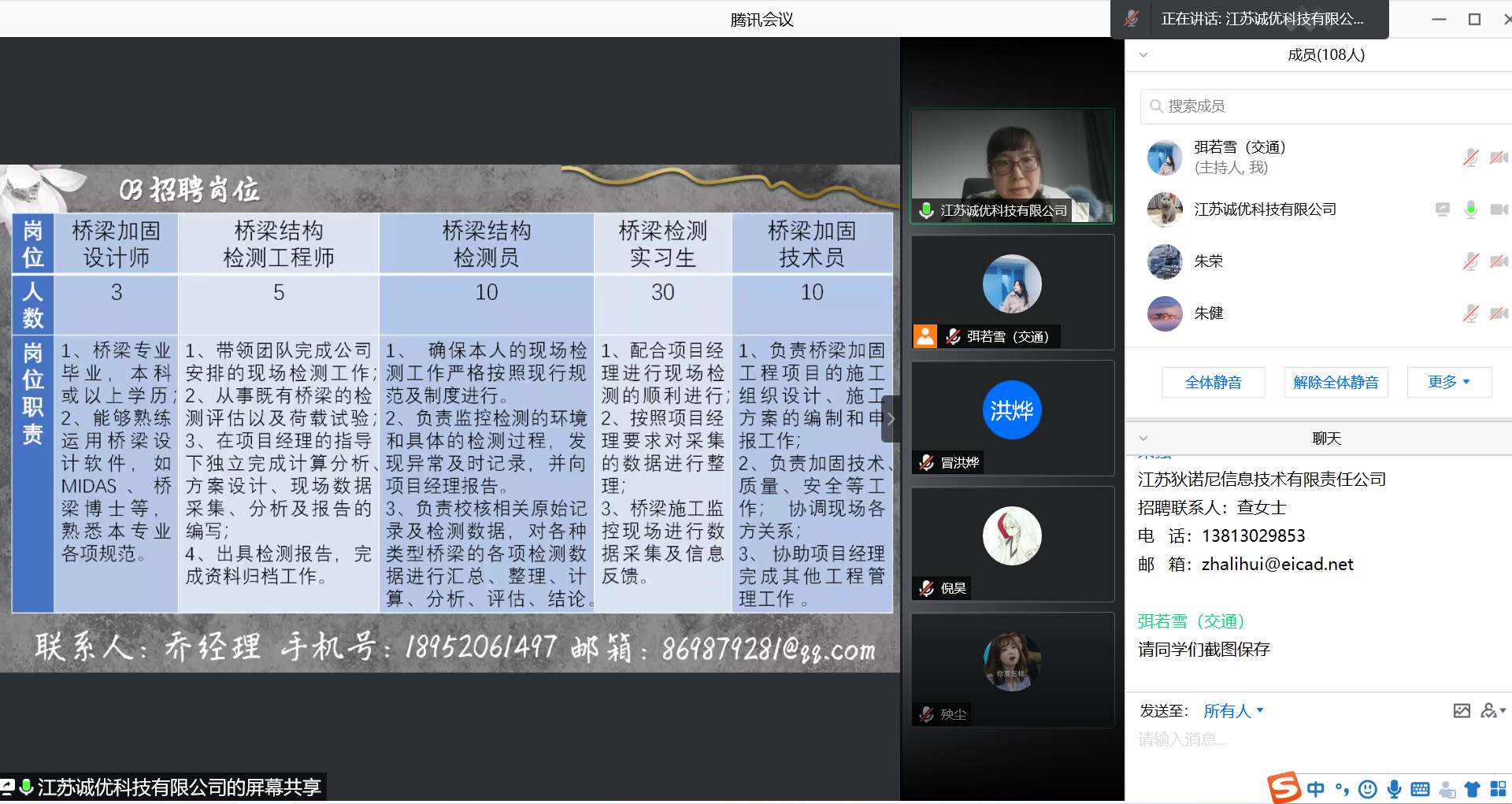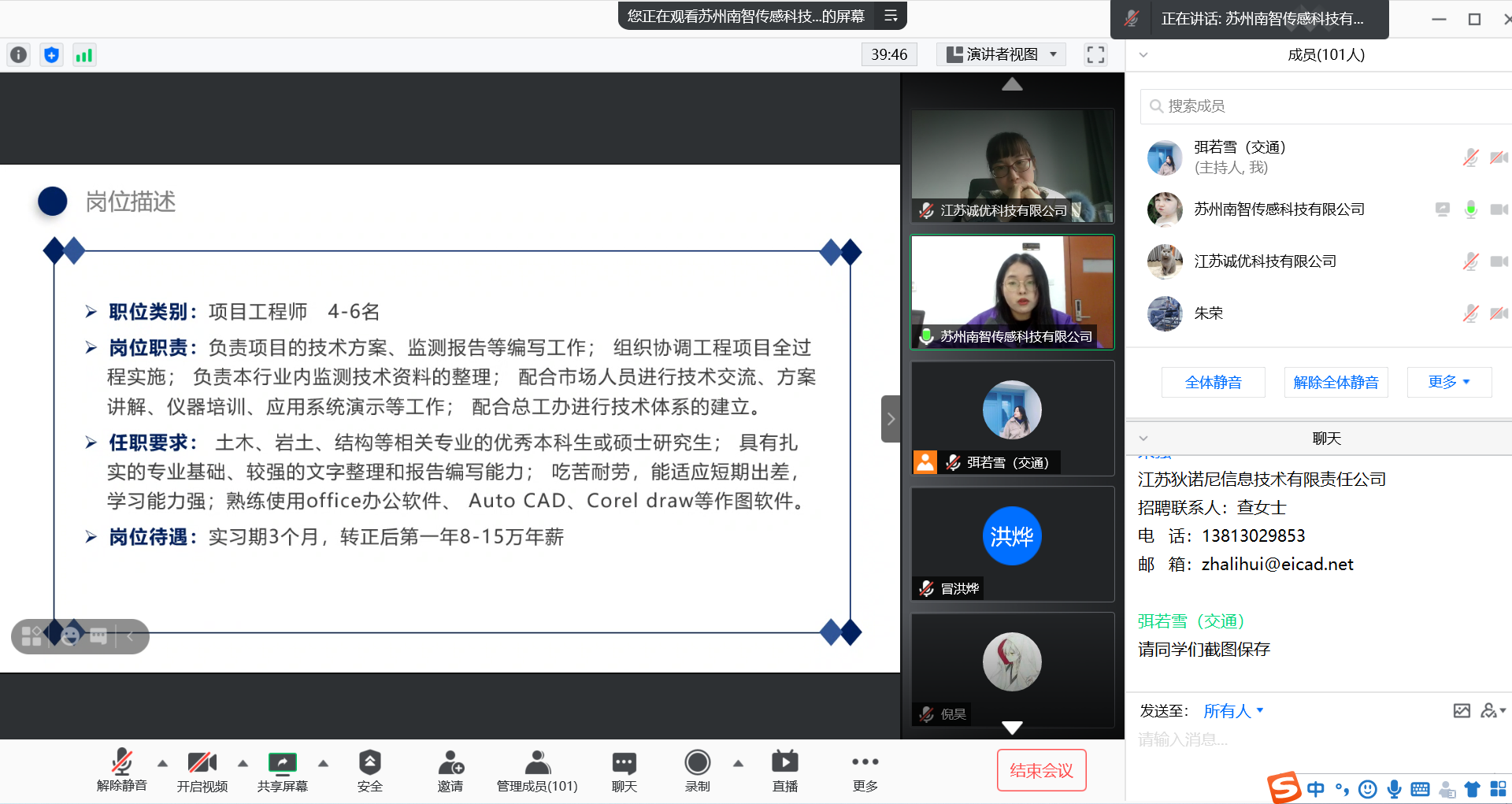 为有效落实全员抓就业新举措,本次邀请到企业都是来自学院各专业系主任或教授引荐。毕业班辅导员弭若雪首先对参加活动的企业表示欢迎,通过直播向广大用人单位介绍学院学科特色和国家级及省级一流专业建设点情况,并介绍了学院2021届毕业生就业动态,鼓励员工积极通过线上线下多种渠道获取就业信息,抓住3月份招聘高峰窗口期去落实适合自己的岗位,号召老员工们拥抱变化,先就业、再择业。各家企业就本单位最新发展成果和岗位需求进行了介绍,对企业的公司简介、薪酬福利和简历投递等内容进行了详细介绍。