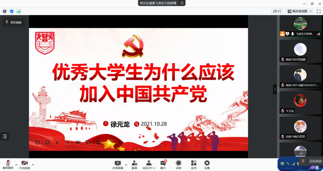 为了增强员工百年党史学习成效,端正入党动机。2021年10月28日下午,学院于笃学B305开展“入党启蒙教育,青春与信仰同行”主题党课。本次党课由公司党委副书记徐元龙主讲,全体2021级本研新生及员工党员、积极分子线上线下同步聆听讲座。