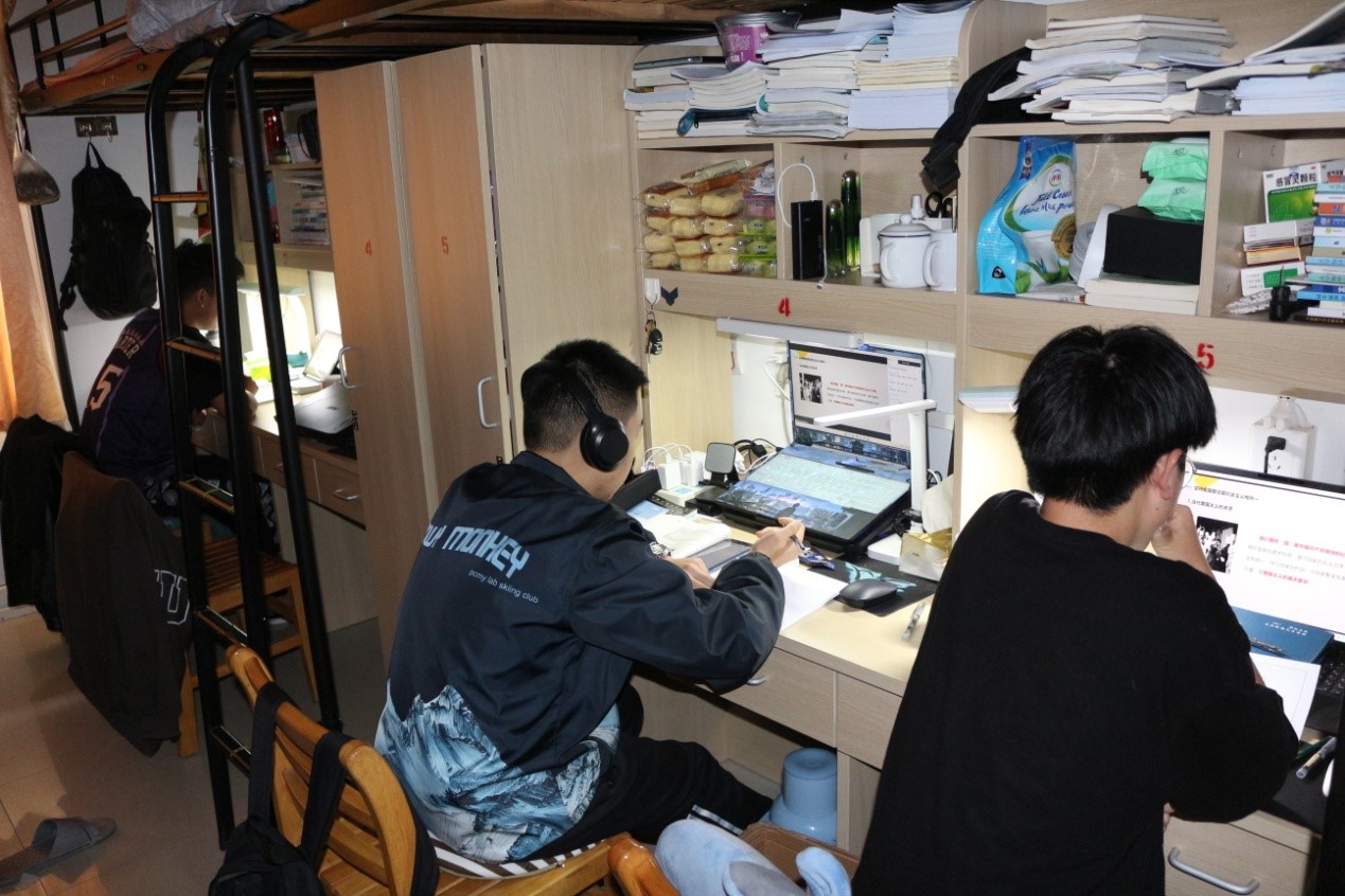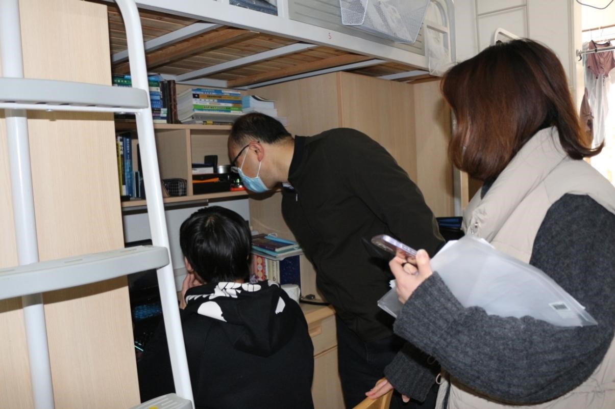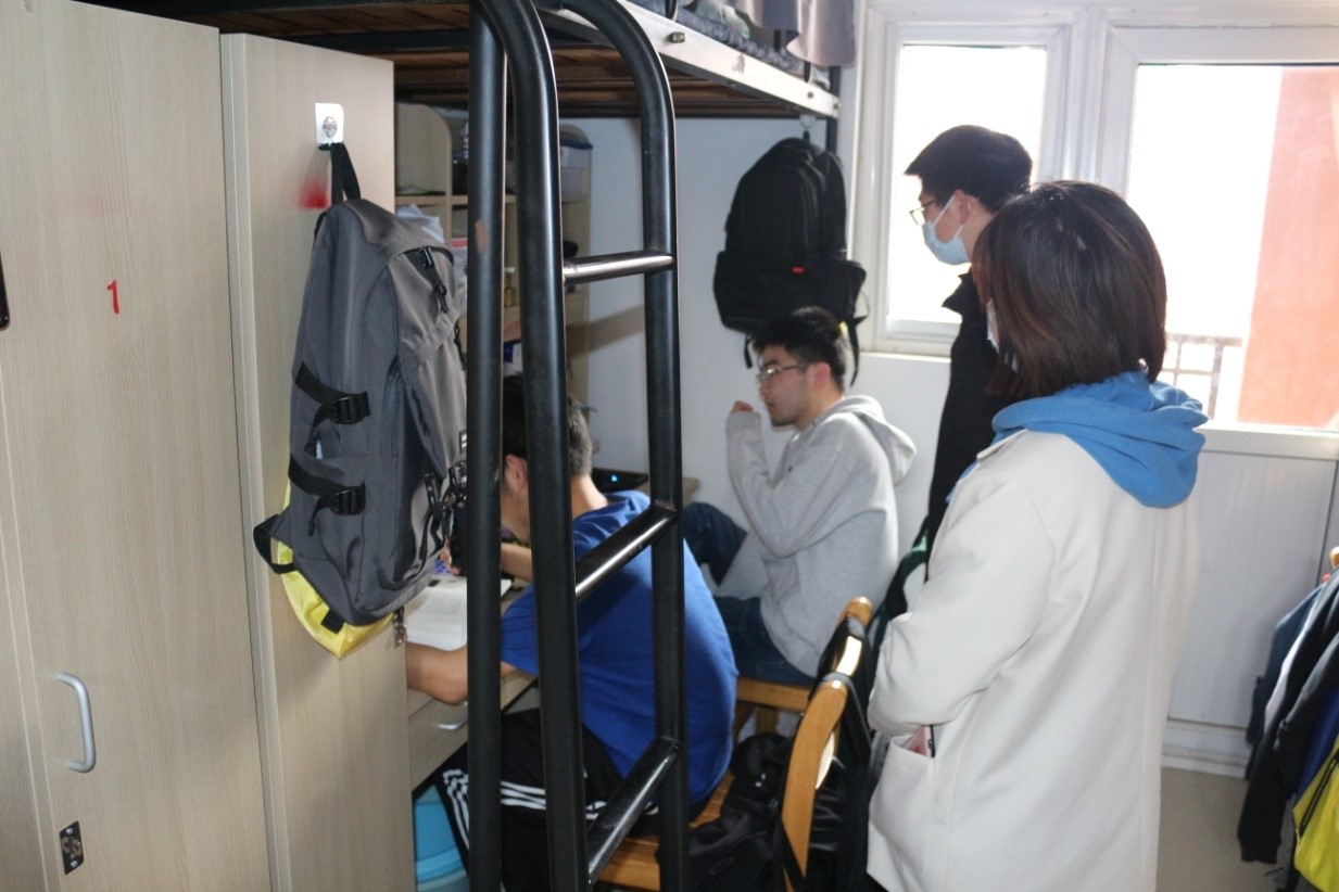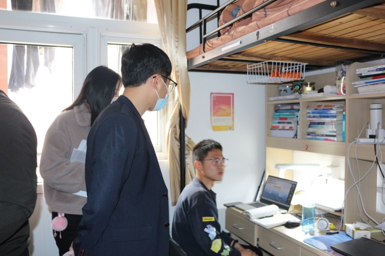 在线上教学课间,学院老师与同学们进行了亲切的交谈,详细了解了同学们在宿舍进行线上学习的具体情况和遇到的困难,叮嘱大家携手抗疫,共克时艰,以保证课堂效率为首要原则,认真做好课前预习、课堂记好笔记、课后及时复习巩固。老师对各宿舍内务卫生及疫情防控进行手把手式指导,要求同学们在疫情防控的关键时期,坚持每天做好宿舍内务卫生,务必适时增添衣物,按照良好作息习惯,加强体育锻炼抵御病毒能力。从检查总体情况来看,同学们在线上课堂期间都能做到认真听课,宿舍舍长发挥了较好的线上课堂保障作用,形成了携手共进的良好宿舍学习氛围。