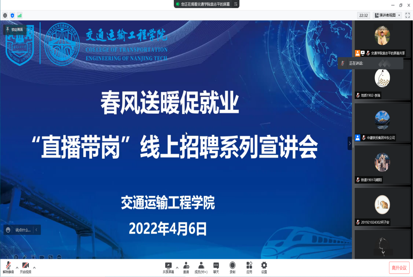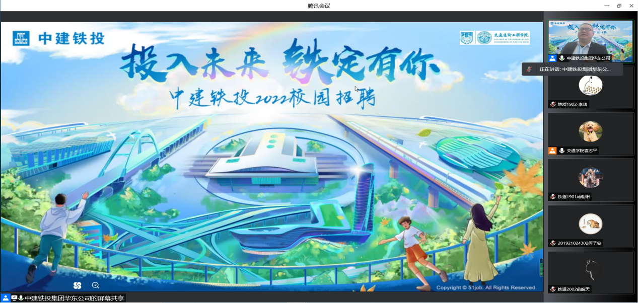 共克时艰战疫情就业服务不停歇,为进一步推进2022届毕业生就业工作,4月6日下午,太阳成集团tyc122cc在腾讯会议平台举办春风送暖促就业“直播带岗”线上招聘首场宣讲会。世界500强企业中建铁投集团华东公司人力资源部杨福宙经理,项目商务总监、公司2014届优秀员工陈申,公司党委副书记徐元龙和公司2022届相关专业毕业生出席。宣讲会由2022届毕业班辅导员袁志平老师主持。