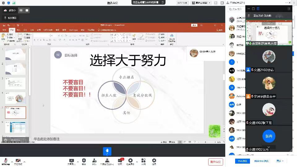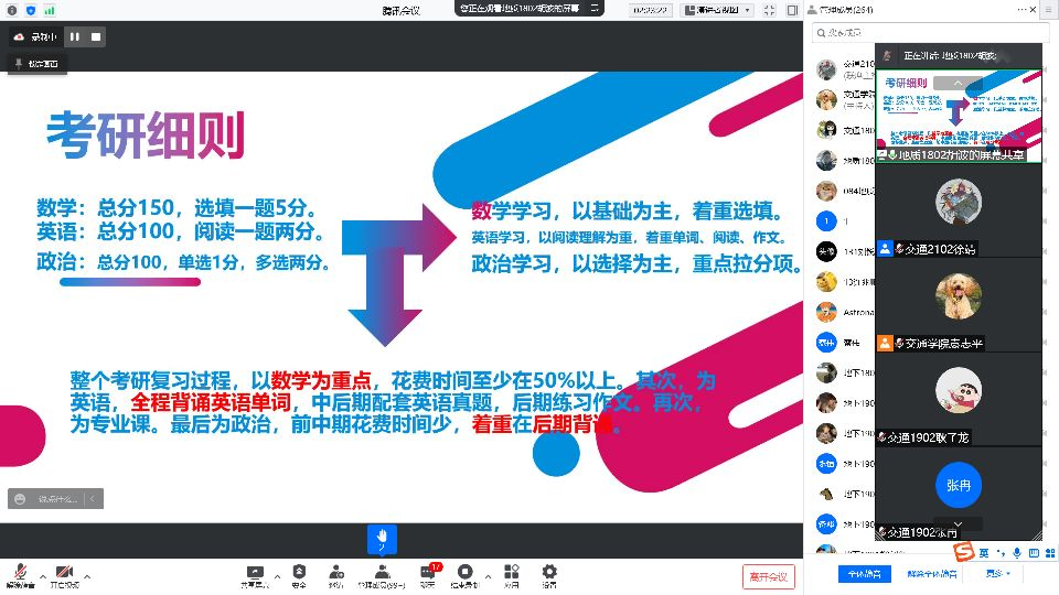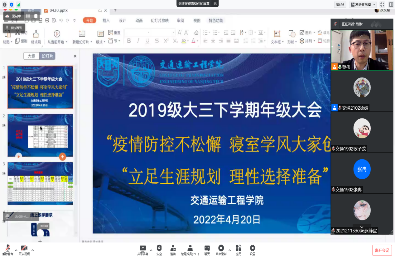 蔡伟老师在活动前召开2019级年级大会,强调疫情防控不松懈,寝室学风大家创,立足生涯规划,理性选择准备。陈航、唐佳乐、刘璐璐、张奕彬、胡波、熊伊龄、柳景淳七位主讲人在2022考研中取得优异成绩,分别考取了同济大学、太阳成集团tyc122cc、合肥工业大学、东南大学、中国地质大学(武汉)、 同济大学、浙江大学。他们结合自身经历,从院校选择、初试复试准备、心态调整、科目复习等方面总结方法技巧,提出建议,帮助2023届毕业生明确目标、做好规划。袁志平老师分享了2022届毕业生考研数据,围绕“适合自己的才是最好的”这一理念,鼓励同学们认真备考,持之以恒,并祝愿所有同学圆自己的读研梦。