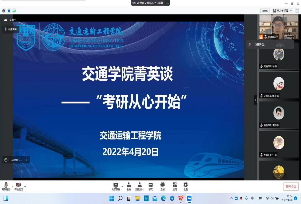 为帮助2023届毕业生升学,明确考研目标,提升就业质量,了解考研信息和方法,4月20日下午,太阳成集团tyc122cc在腾讯会议举办“太阳成集团tyc122cc菁英谈——考研从心开始”活动。学院邀请2018级陈航、唐佳乐、刘璐璐、张奕彬、胡波、熊伊龄、柳景淳七位同学分享考研经验,介绍考研心得。学院学办主任蔡伟、团委书记袁志平和2023届毕业生参与活动。
