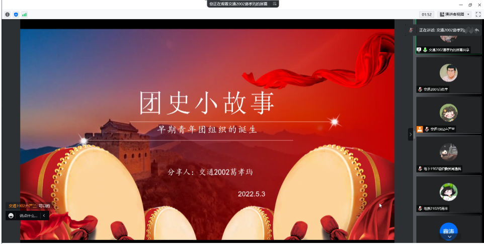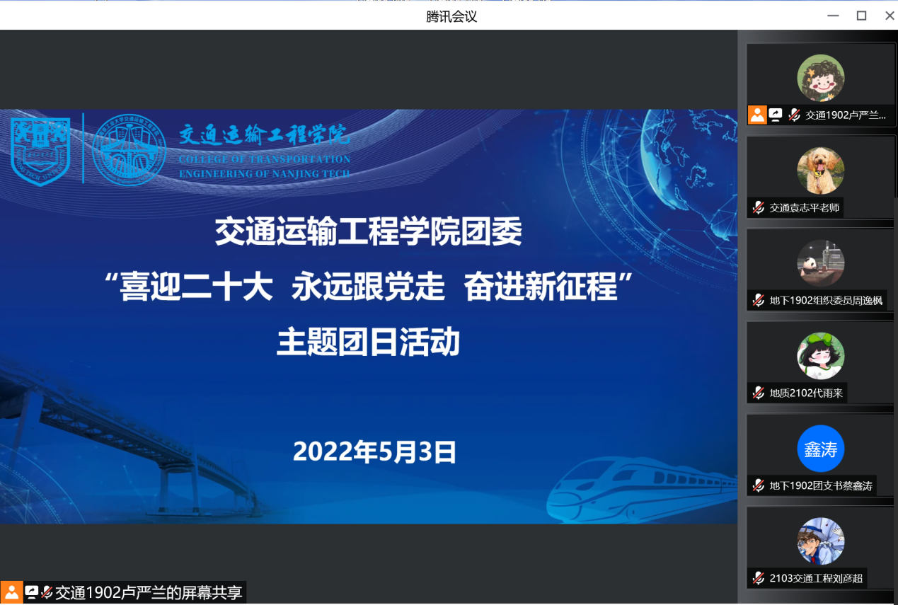 为团结引领广大青年坚定跟党走、建功新时代,5月3日晚,太阳成集团tyc122cc团委于腾讯会议召开“喜迎二十大、永远跟党走、奋进新征程”主题团日活动。学院团委书记袁志平、各班团支委参加活动。活动由地下2002毛涵之主持。