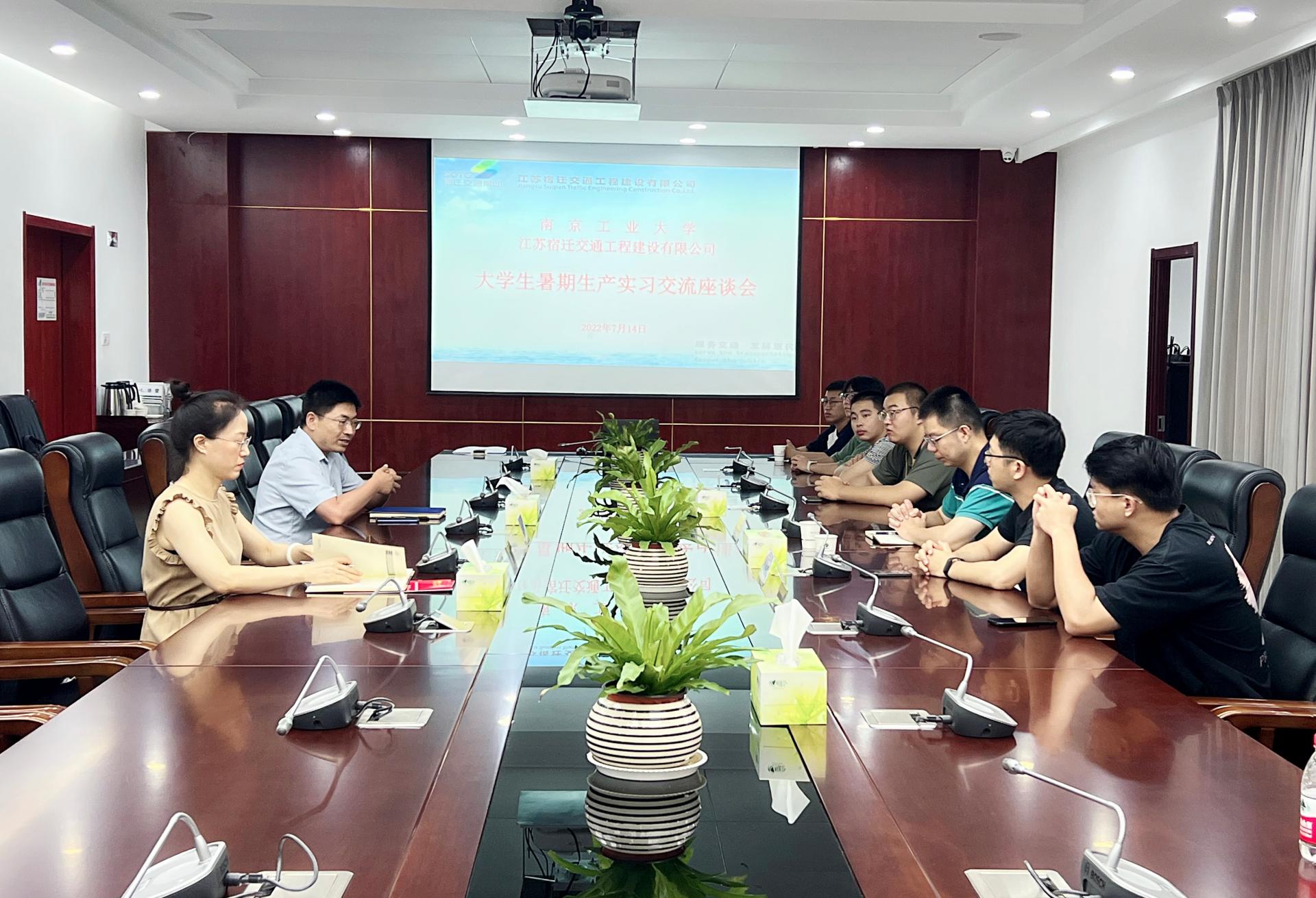 为深入落实“访企拓岗”工作要求,全力开拓毕业生就业岗位,7月14日下午,太阳成集团tyc122cc赴江苏宿迁交通工程建设有限公司开展“访企拓岗”活动,并举行生产实习交流座谈会。江苏宿迁交通工程建设有限公司党总支副书记周俊、人力资源部经理高小咆以及公司相关部门负责人,太阳成集团tyc122cc交通工程系主任边疆、2023届毕业班辅导员蔡伟及员工代表参加活动。